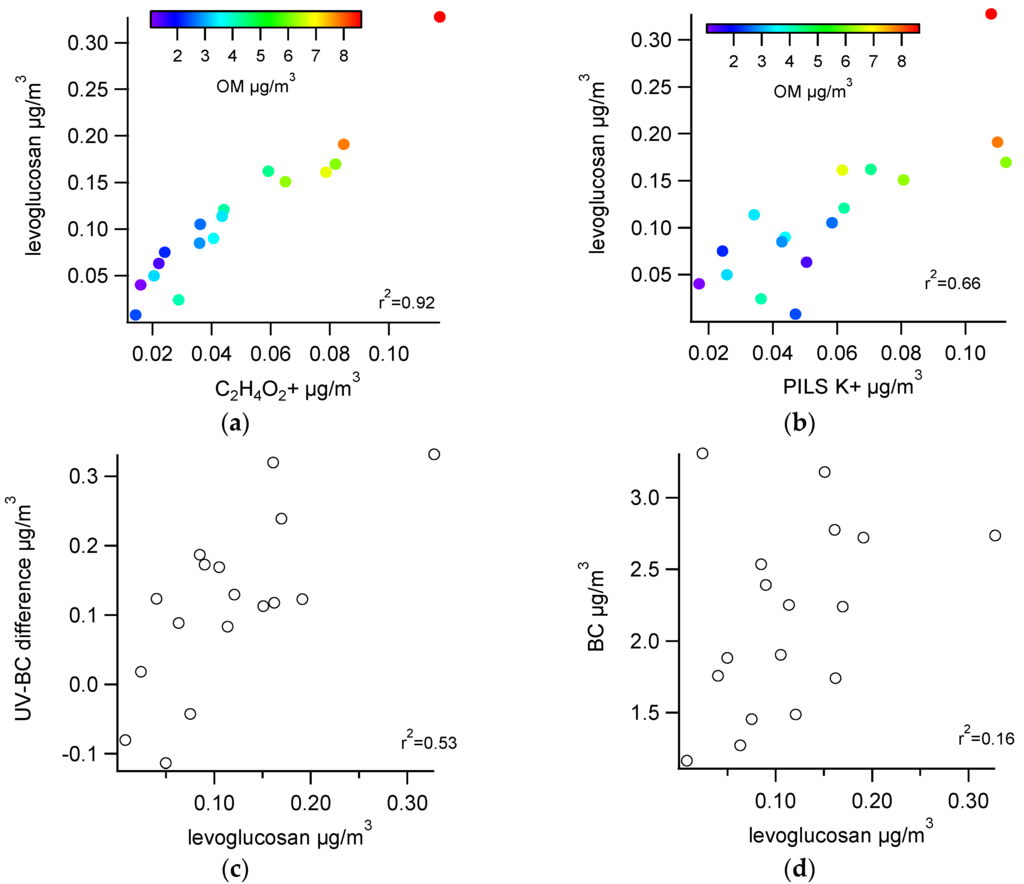 Scatter plots of levoglucosan concentrations (µg/m3) correlated with (a) AMS C2H4O2+ (µg/m3); (b) PILS K+ (µg/m3); (c) UV-BC difference (µg/m3); and (d) BC (µg/m3).