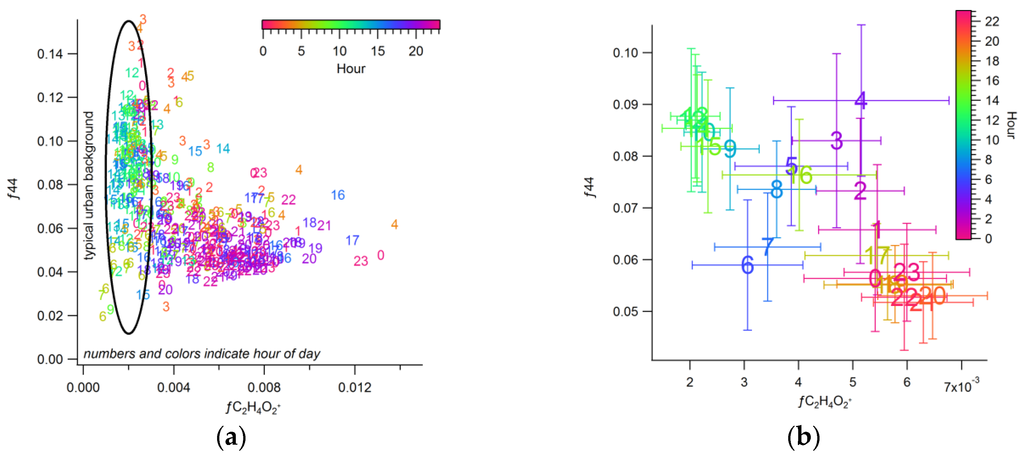 Scatter plot of the fraction of OM from m/z 44 and C2H4O2+, with color and numbers indicating hour of the day, for: (a) all data (hourly averages); and (b) data averaged by hour during the study.