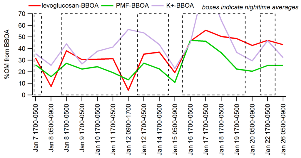 The sample with the highest disagreement between methods was the night of 19 January, when levoglucosan-BBOA and K-BBOA are similar (37%–39% of the OM) but are 1.6 times higher than PMF-BBOA. As seen in Figure 1, this was not only the evening of the highest levoglucosan and C2H4O2+ concentrations but also highest OM. It may be that PMF is under-predicting the amount of BBOA, since the OM concentration and possibly composition is quickly changing. The Q/Qexpected ratio and scaled residuals from PMF during this evening are low, indicating a good fit, but SV-OOA is also very high during this evening, so it is likely that some mass assigned by PMF as SV-OOA is actually BBOA. Since a constant profile is needed in PMF, differences in the BBOA composition between evenings mean that a “typical” or average profile is found; deviations from this profile suggest that mass appears to be apportioned to SV-OOA. However, as the results are consistent for all the other data points, our conclusion is that the three BBOA methods using levoglucosan and AMS data compare rather well most of the time. As there are other non-biomass burning sources of K+ in the area, and the amount of K+ emitted depends on the amount of flaming vs. smoldering emissions, assuming all the K+ is from biomass burning yields an upper limit of BBOA that is likely less accurate than the other methods used here.