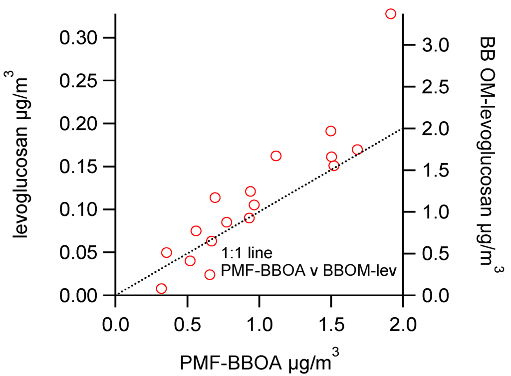 Comparison of PMF-BBOA concentrations vs. levoglucosan (primary y-axis) and BB OM by levoglucosan (secondary y-axis); all units are µg/m3.