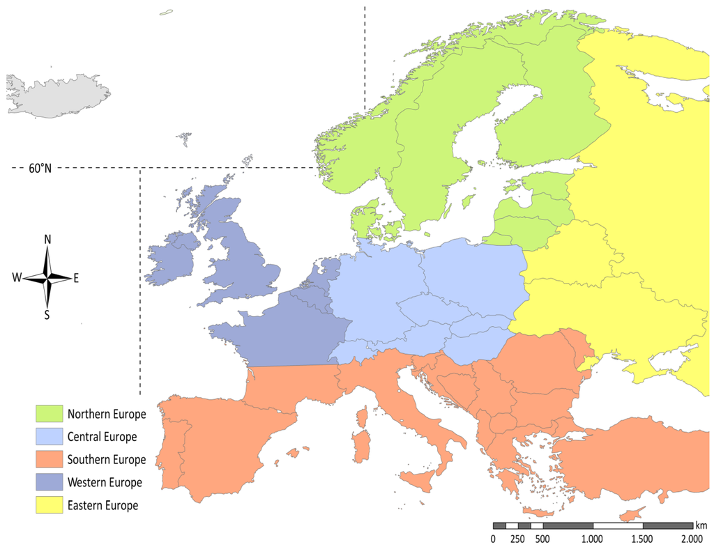 To better account for typical large-scale circulation patterns known to occur over the NAER, we divided the study area into the seven subregions (Figure 1) in a similar fashion, as has been done by [24]. The subregions we defined are (i) North Atlantic north of 60°N; (ii) North Atlantic south of 60°N; (iii) Northern Europe (including Baltic Sea); (iv) Central Europe; (v) Southern Europe; (vi) Western Europe (including North Sea); and (vii) Eastern Europe. Based on the individual study-specific ES-values, total ES-scores and mean ES-values () were calculated to provide the total and mean weight of all studies pooled for one of the subregions.