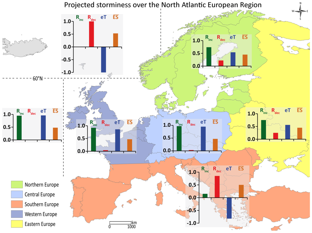 The present analysis is a modification of the approach of [22]. In their review of the past, present, and future storminess over the NAER, they interpreted findings from 32 studies on the basis of a categorical evaluation scheme of