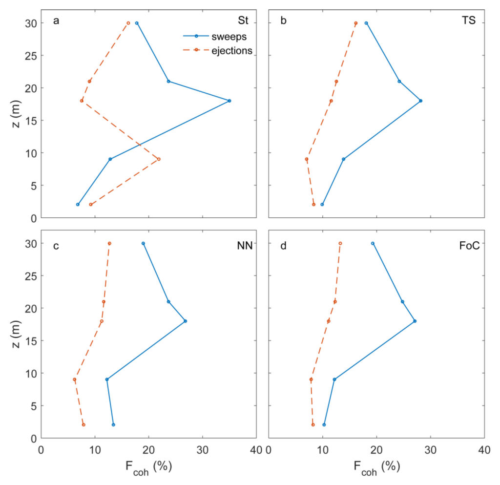 Results from the analysis of the contribution of sweeps and ejections to Fcoh under different atmospheric stabilities are shown in Figure 7. Values for Fcoh,sw peaked at canopy height and decreased with height above the canopy, whereas Fcoh,ej still increased above the canopy. This behavior was also observed in a previous study [33]. Increasing Fcoh,ej above the canopy indicates the transition from a flow dominated by shear-driven coherent structures to a flow associated with rough-wall boundary layers [6].