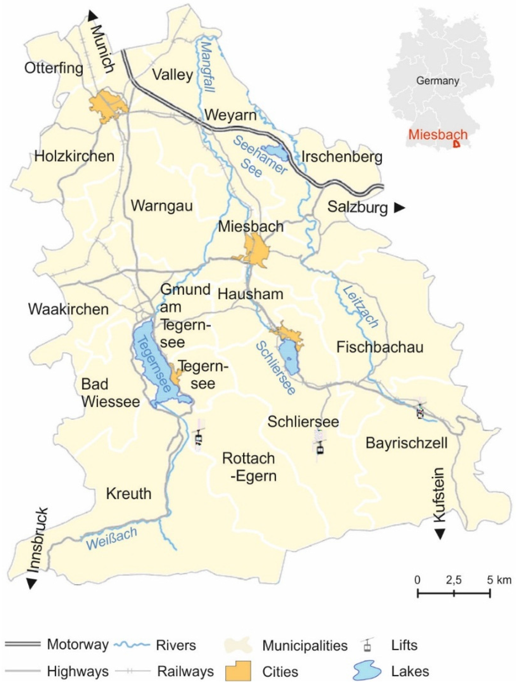 The survey was conducted in ten municipalities in the district of Miesbach (Bavarian Alps, Southern Germany; Figure 1) during the last week of August 2014 (Table 1). The region is a nationally renowned tourism destination with 2.1 million overnight stays (65% thereof in the summer half year). Tourists were randomly chosen in populated areas such as town centers, lakes, mountain huts etc. and were asked to fill out the questionnaire, provided that they stayed at least one night in this region for recreational purposes. As 92% of tourists in this region come from Germany, only German-speaking tourists were surveyed.