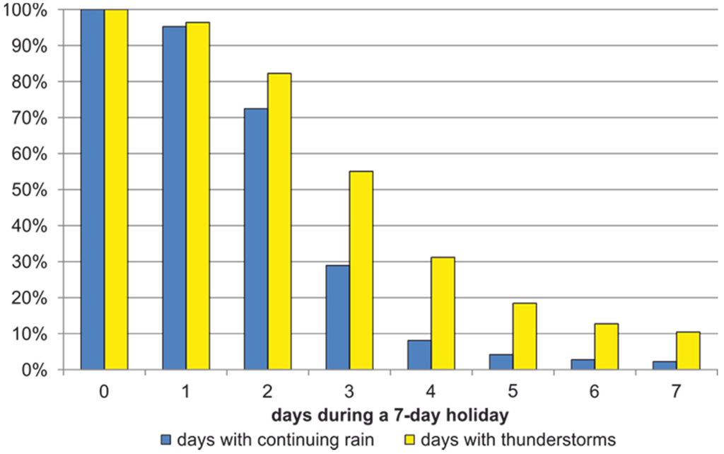 The acceptable number of days with rain depends on the type of rain: temporary showers caused by thunderstorms are more acceptable than continuing rain. While outdoor activities can still be executed on days with thunderstorms predominantly occurring in the second half of the day, continuing rain prevents many outdoor activities or makes these activities rather unpleasant. Respondents accept two days of continuing rain during a one-week holiday probably because some rainy days are to be expected in this climate and the region offers some variety of indoor tourist activities.