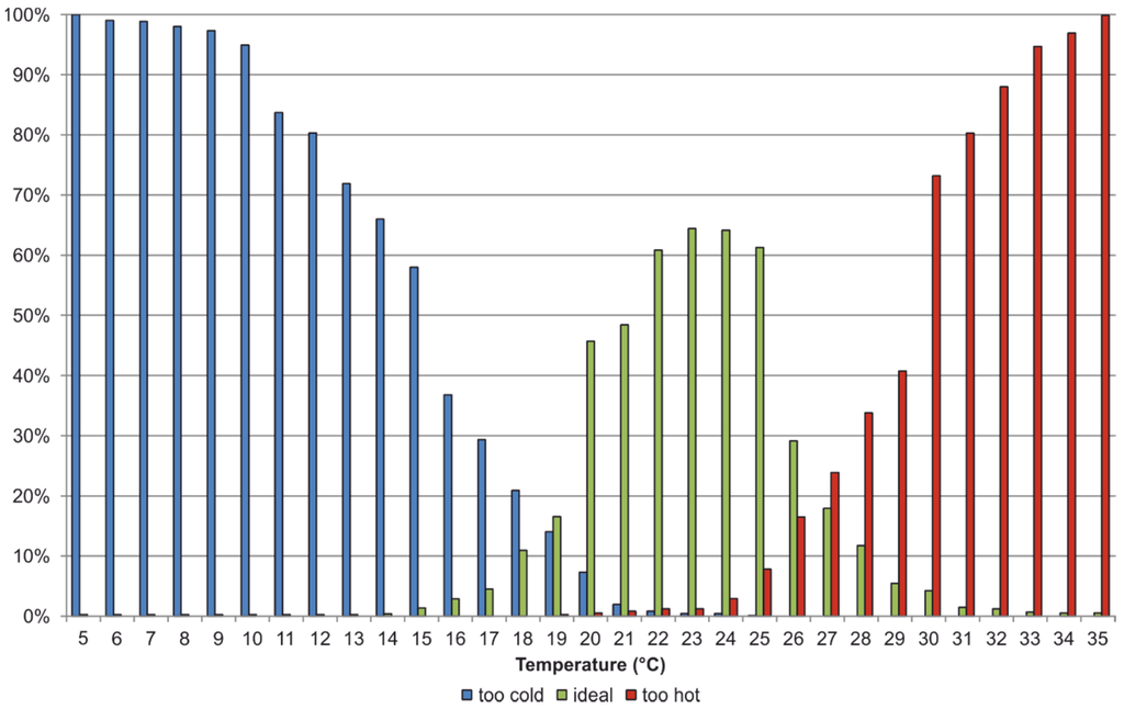 Temperatures perceived as ideal, too hot and too cold. Note: The remaining percentages to 100% are not shown for better readability and refer to temperatures not being chosen by respondents, thus being neither too cold, ideal or too hot.