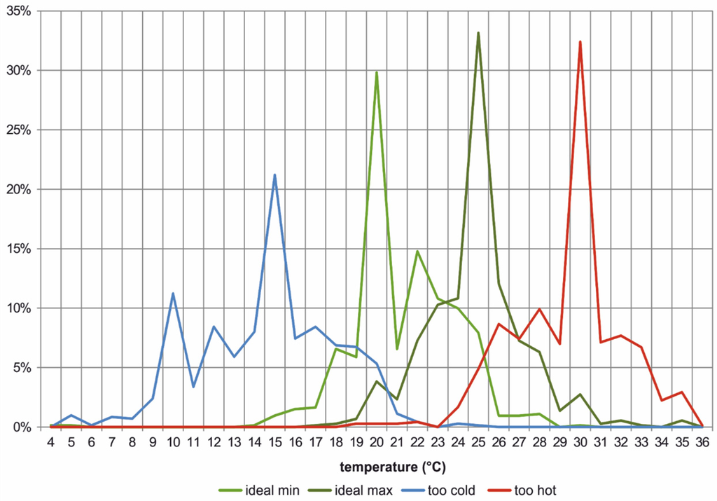 The distribution of stated thresholds of ideal, too hot and too cold temperature shows that convenient numbers were chosen far more often than other temperature values (Figure 4), although we did not ask for a single temperature value (like e.g., [36]) but for a range of ideal and unacceptable temperatures. For the lower threshold of the ideal temperature range, a clear peak at 20 °C can be seen (30% of respondents). For the upper threshold of the ideal temperature range, the peak is at 25 °C (33%). The threshold for temperatures perceived as too cold has a major peak at 15 °C (21%) and a minor peak at 10 °C (11%). The ‘too hot’ threshold shows a clear peak at 30 °C (32%). This may indicate that a considerable share of respondents was challenged by 1 °C increments in the temperature scale and thus many respondents rather chose the ‘easy’ numbers.