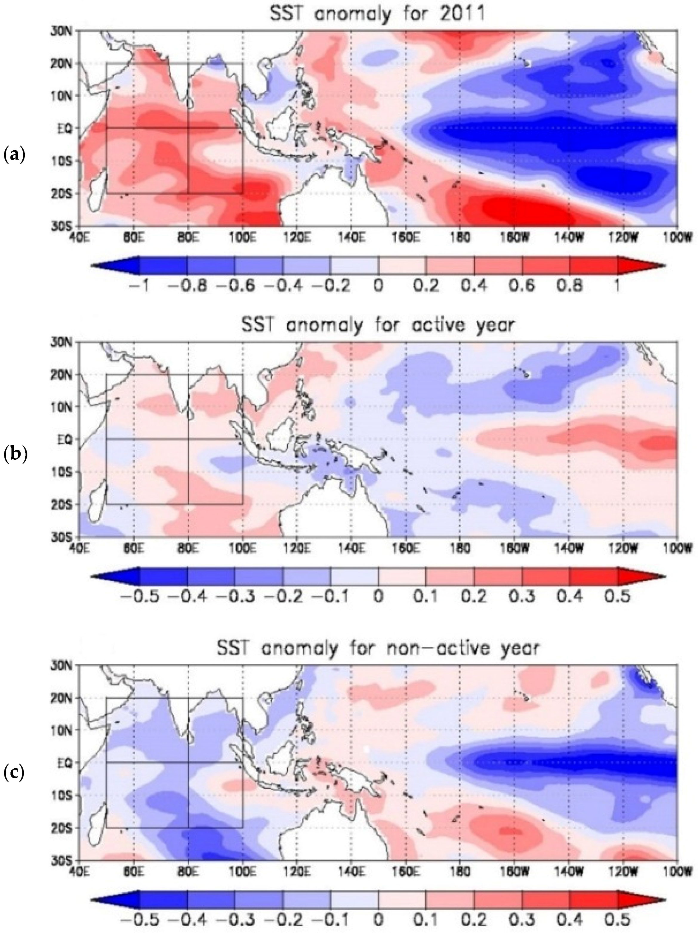 Figure 2b,c exhibits the GPI anomaly fields composited for the MJO active years and for the La Niña years, respectively, in comparison with the GPI anomaly in 2011. The spatial pattern over the tropical Indian Ocean in 2011 is very similar to the feature in the MJO active years, although the magnitude of the anomalies in 2011 is more pronounced than that composited for the MJO active years. Consistent with this feature, the number of TCG during OND in 2011 is eight (