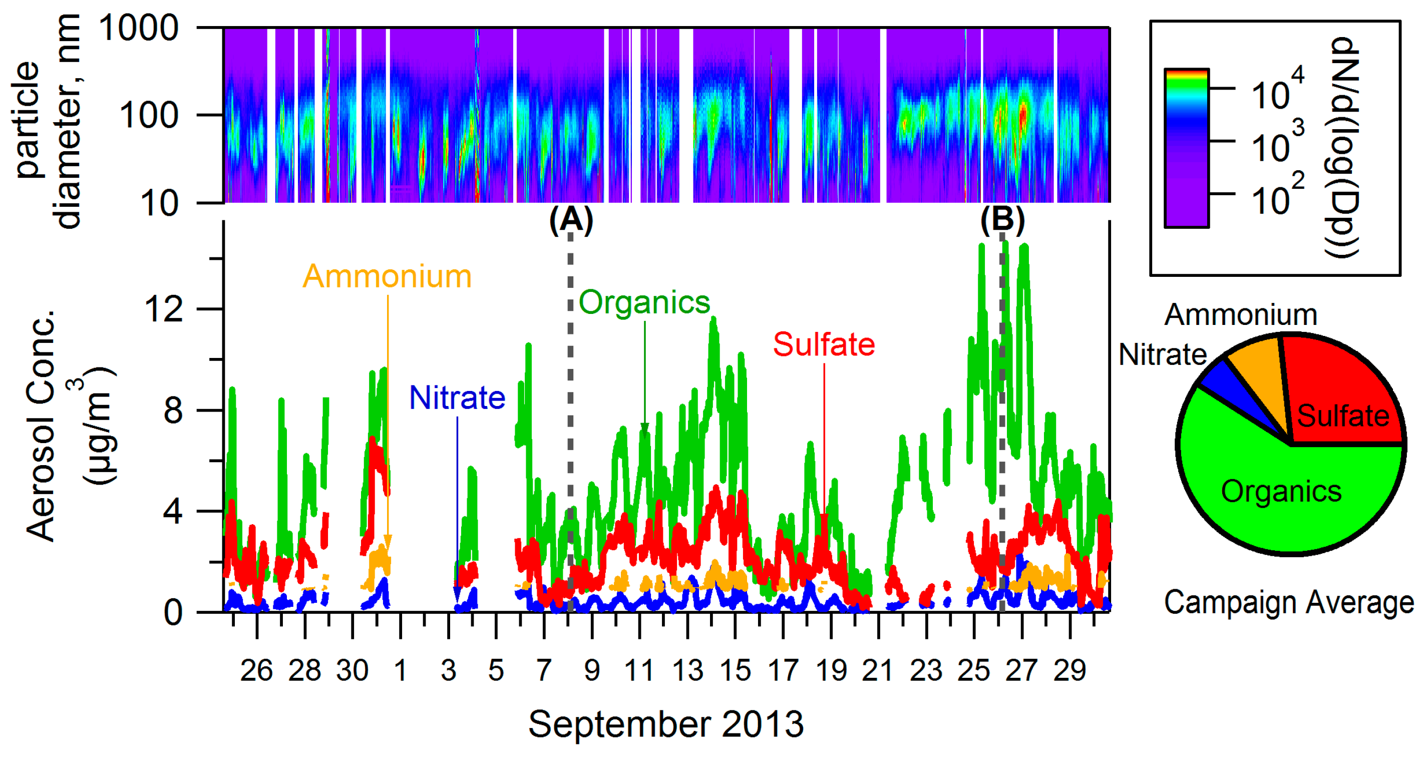 Figure 1 shows a time series of particle size distributions (top), a time series of bulk concentrations measured by the ACSM (bottom), and the campaign-average bulk concentration (right). The ACSM nitrate measurements (sum of NO+ and NO2+ fragments) can be attributed to inorganic nitrate and/or -ONO2 functional groups on organic nitrates. Measurements indicate that the nitrate measured by the ACSM in Conroe is mostly organic. One indication of this is the NO+:NO2+ ratio in ACSM measurements, which is estimated from the fragmentation table-corrected unit mass resolution data. In the ACSM used for this study a ratio of 2.6–3.9 has been measured for ammonium nitrate. For organic nitrate this ratio has varied but has always been greater than 5 for this instrument. The average NO+:NO2+ ratio for this data set is 13.4, which is consistent with organic nitrate (and inconsistent with ammonium nitrate). Filter measurements also indicate that nitrate measured by the ACSM was mostly organic (see Appendix B): filter measurements of inorganic nitrate are significantly lower than ACSM measurements of total nitrate (Figure A4C). Further, the molar ratio of NH4:SO4 indicates that on average there was no excess NH4 as required for the formation of ammonium nitrate.