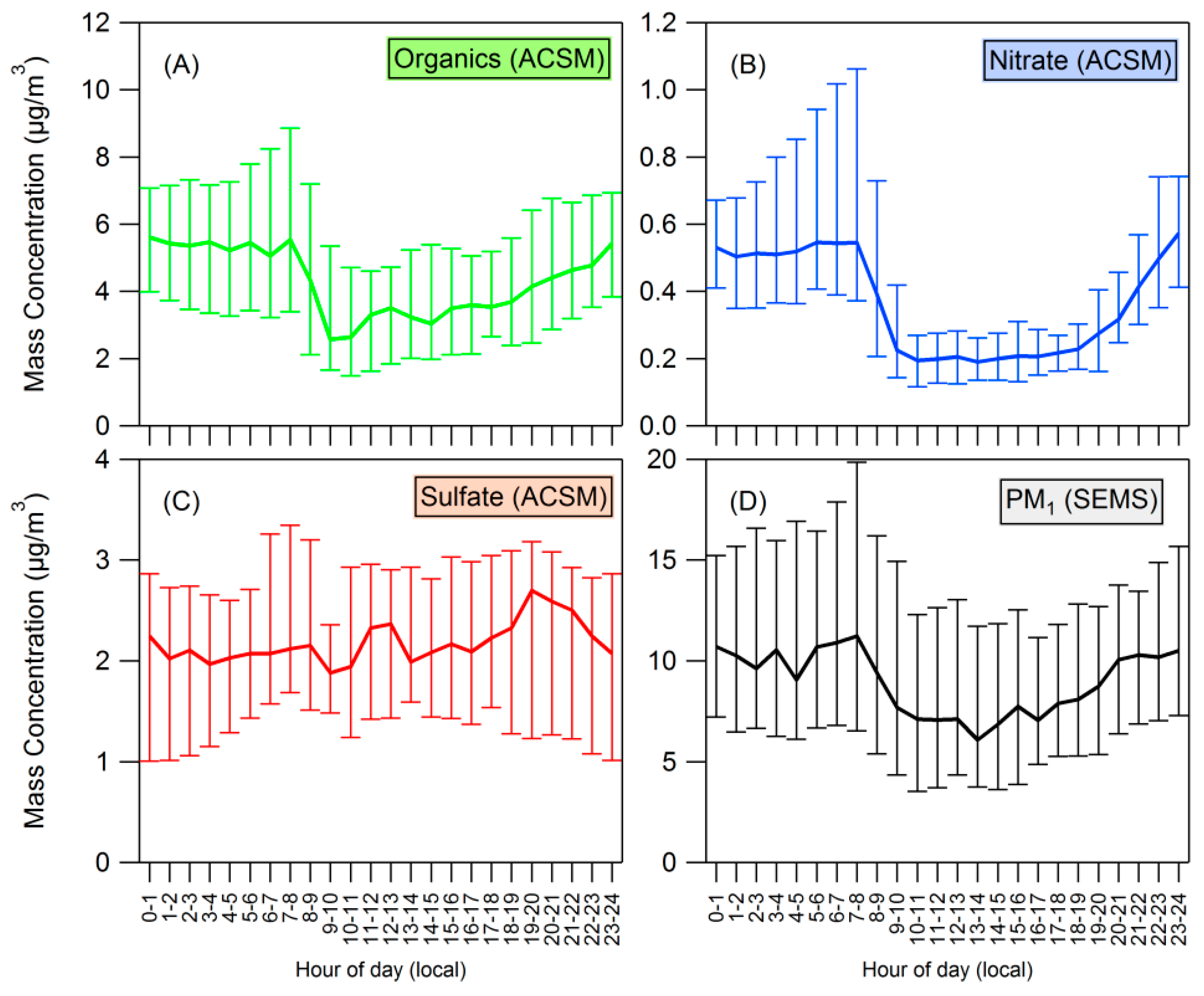 (A–C) Diurnal plots for organics, nitrate, and sulfate measured by the ACSM; (D) PM1 measured by the SEMS. Median values are plotted, with error bars showing the 25th and 75th percentiles.