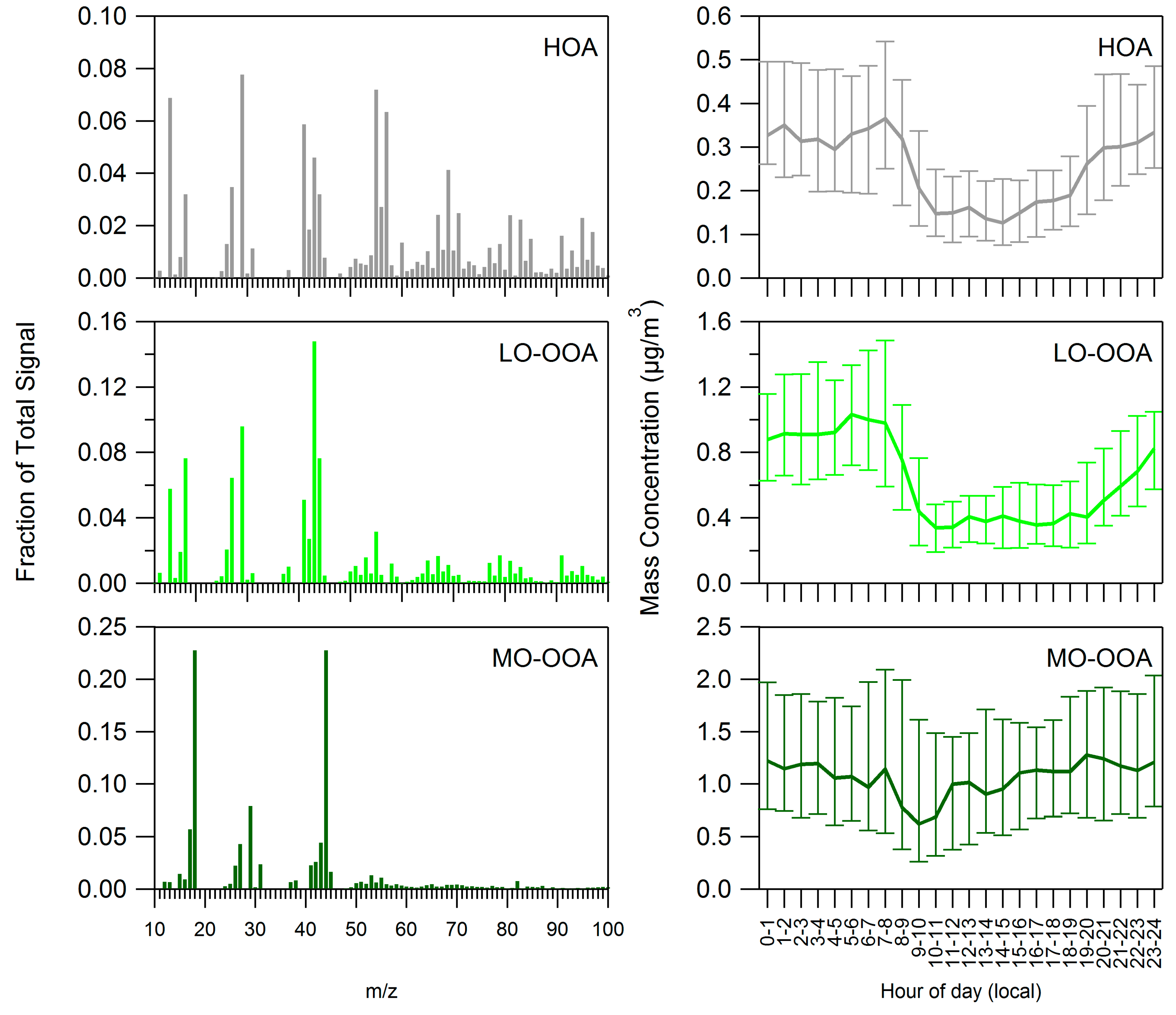 The mass spectra and diurnal cycles of the three factors are shown in Figure 3. Two of the factors resemble oxygenated organic aerosol (OOA), the other factor resembles fresher organic aerosol. We name the more oxidized OAA factor (f43 = 4.4%, f44 = 22.7%) MO-OOA (more oxidized OOA) and the less oxidized OOA factor (f43 = 14.8%, f44 = 7.6%) LO-OOA (less oxidized OOA). The third factor has mass spectral signatures representative of hydrocarbon like organic aerosol (HOA) and biomass burning organic aerosol (BBOA), but we refer to the third factor (f43 = 4.6%, f44 = 3.2%) as HOA for simplicity.