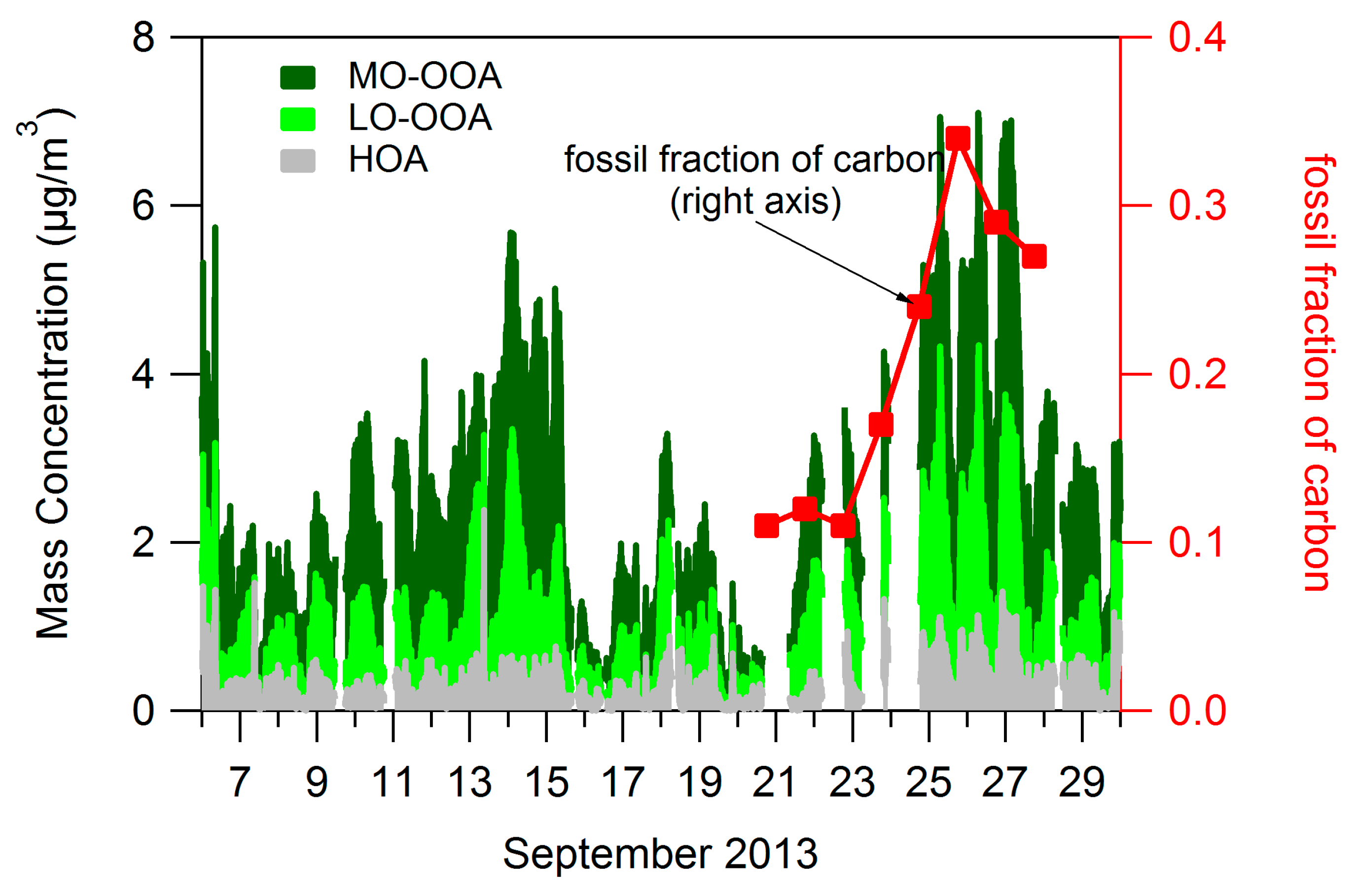 Figure 4 shows time series of the factors in terms of fraction of total organics (the sum of all 3 factors). The 12 days before 6 September were included in PMF calculations but excluded from Figure 4 to facilitate viewing of radiocarbon results. HOA can constitute 30% or more of OA on days when overall PM concentrations are low (7 September, 16–21 September). However, fresh emissions represented by HOA constitute a smaller fraction (less than 20%) of PM on high concentrations days, such as 10–15 September and 25–28 September. On these higher concentration days a larger fraction of the increased PM levels are due to MO-OOA (and LO-OOA to a lesser extent), consistent with atmospheric conditions which transport highly processed OA or allow existing OA to become highly oxidized. The results of radiocarbon analysis (see Section 2.2.4) are also shown in Figure 4. Fossil carbon constituted as little as 10% of carbon in OA during the low concentration period from 21–23 September but was approximately 30% of carbon during the high concentration period from 25–28 September, suggesting that a higher fraction of OA originates from fossil sources of carbon on higher concentrations days.