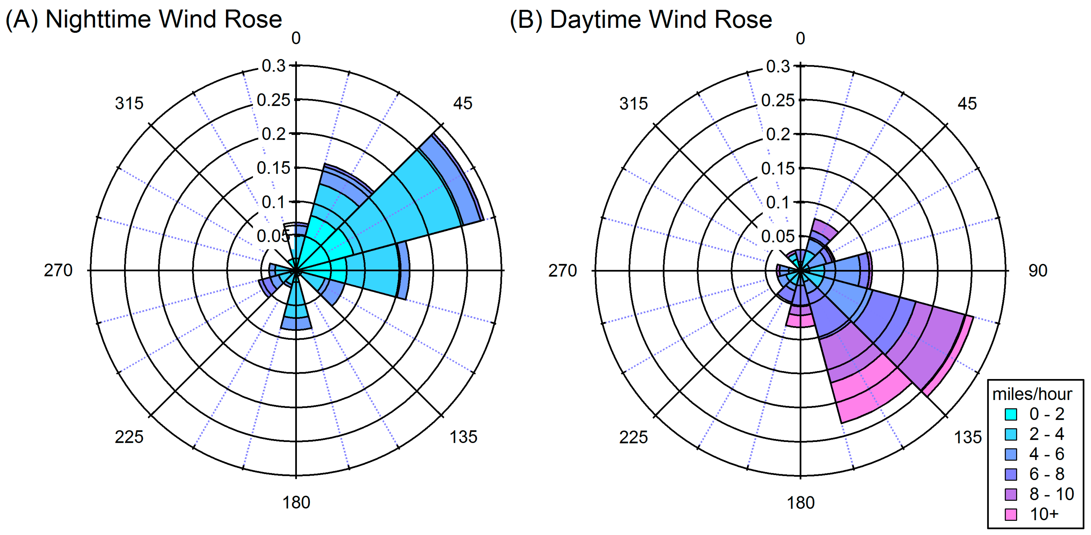 Wind rose plots for (A) night (0:00–6:00) and (B) day (12:00–18:00) averaged over the course of the campaign.
