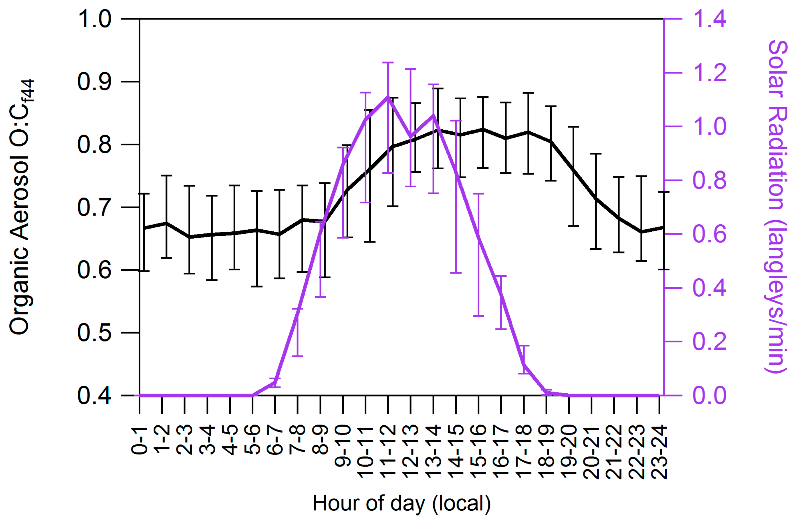 Diurnal cycle of organic aerosol oxygen to carbon ratio (O:Cf44) and solar radiation.