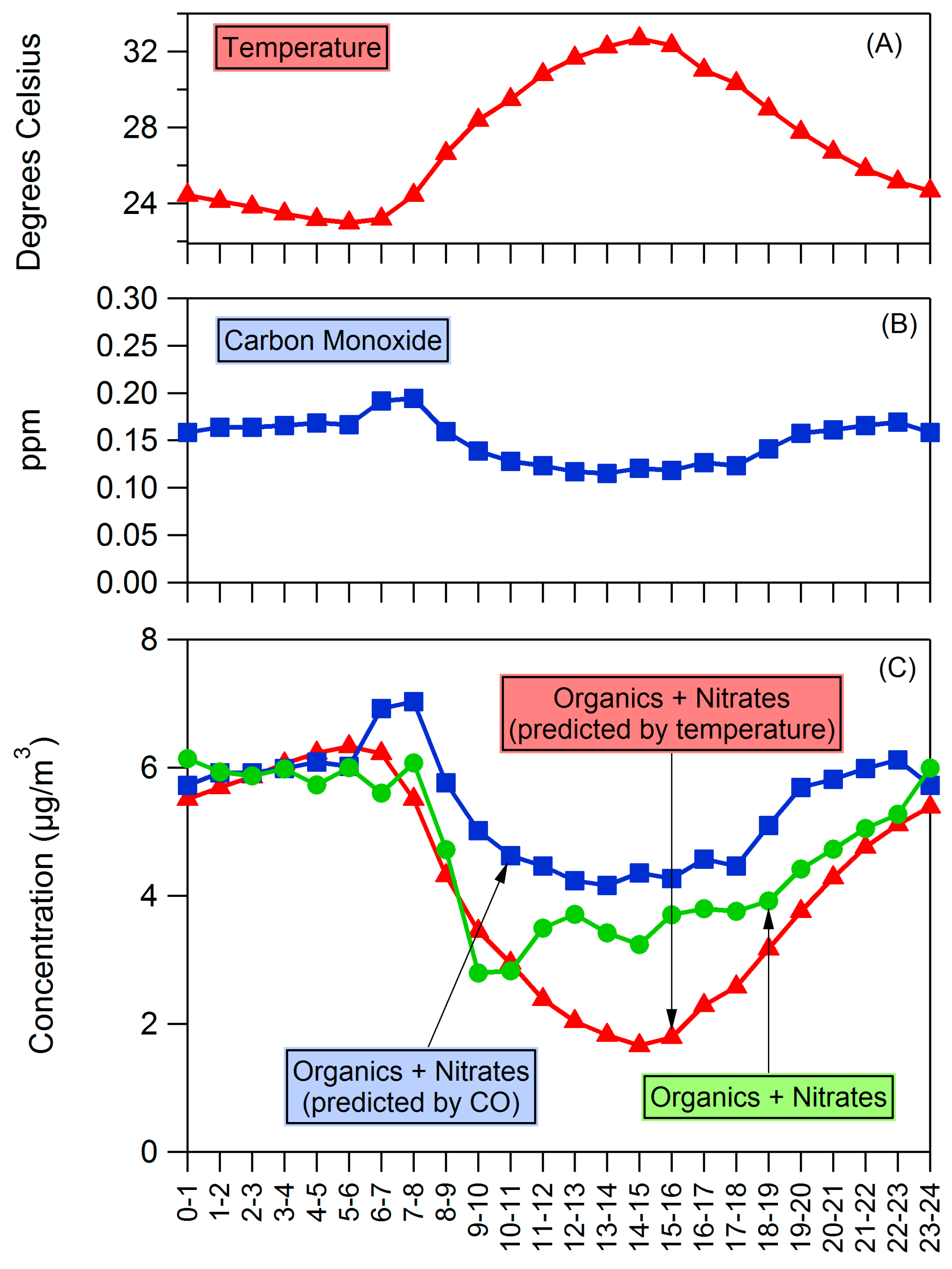 Diurnal profiles of (A) temperature and (B) carbon monoxide. (C) shows the diurnal profile of OA as well as the diurnal profile of OA predicted by temperature and boundary layer height changes. Starting concentrations in predictions are the average of measured concentrations between 0:00 and 6:00.