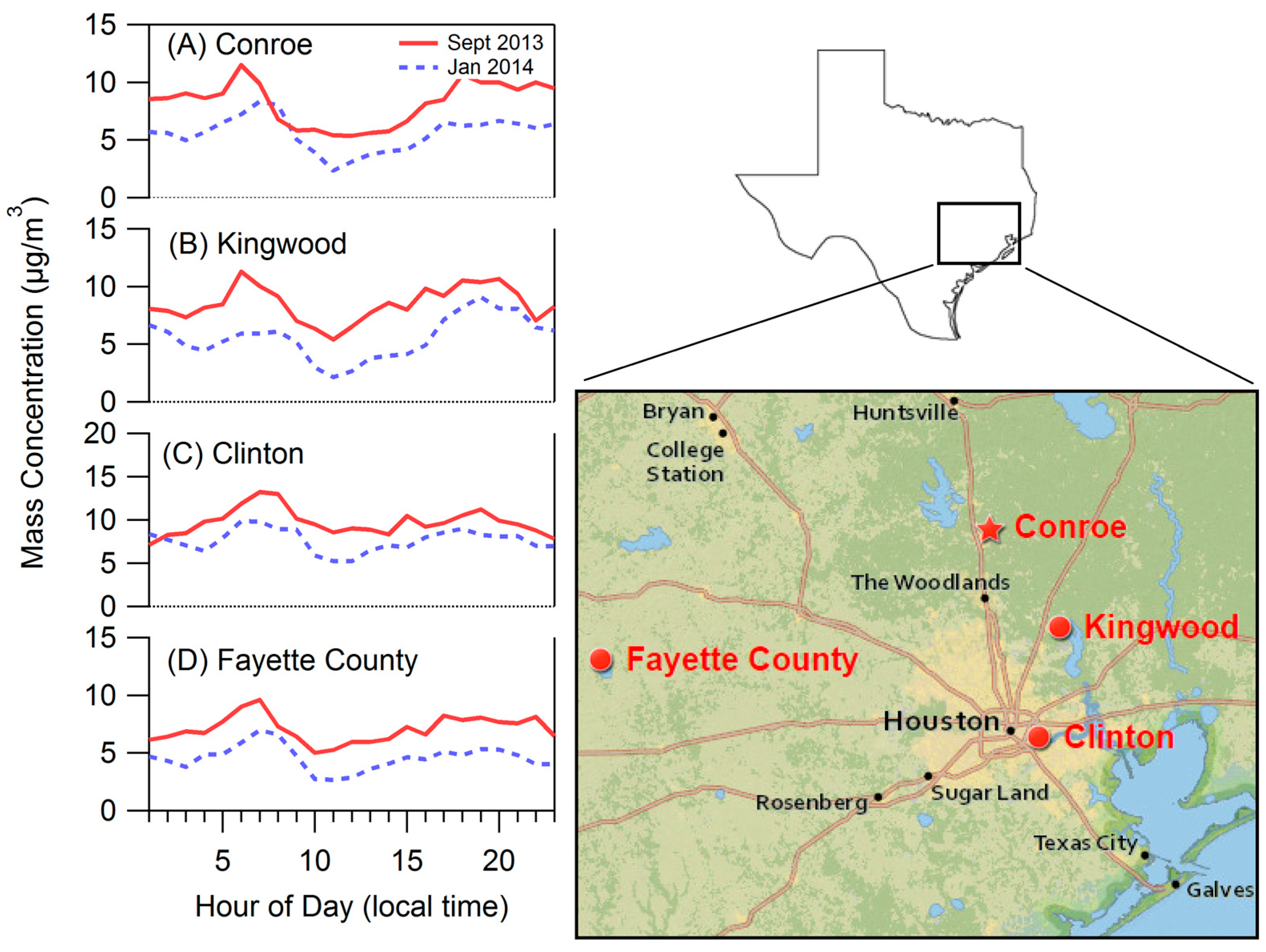 Diurnal plots for Conroe and neighboring areas based on tapered element oscillating microbalance (TEOM) measurements of PM2.5 by the Texas Commission on Environmental Quality (TCEQ). (A) Conroe, (B) Kingwood, (C) Clinton, (D) Fayette County.