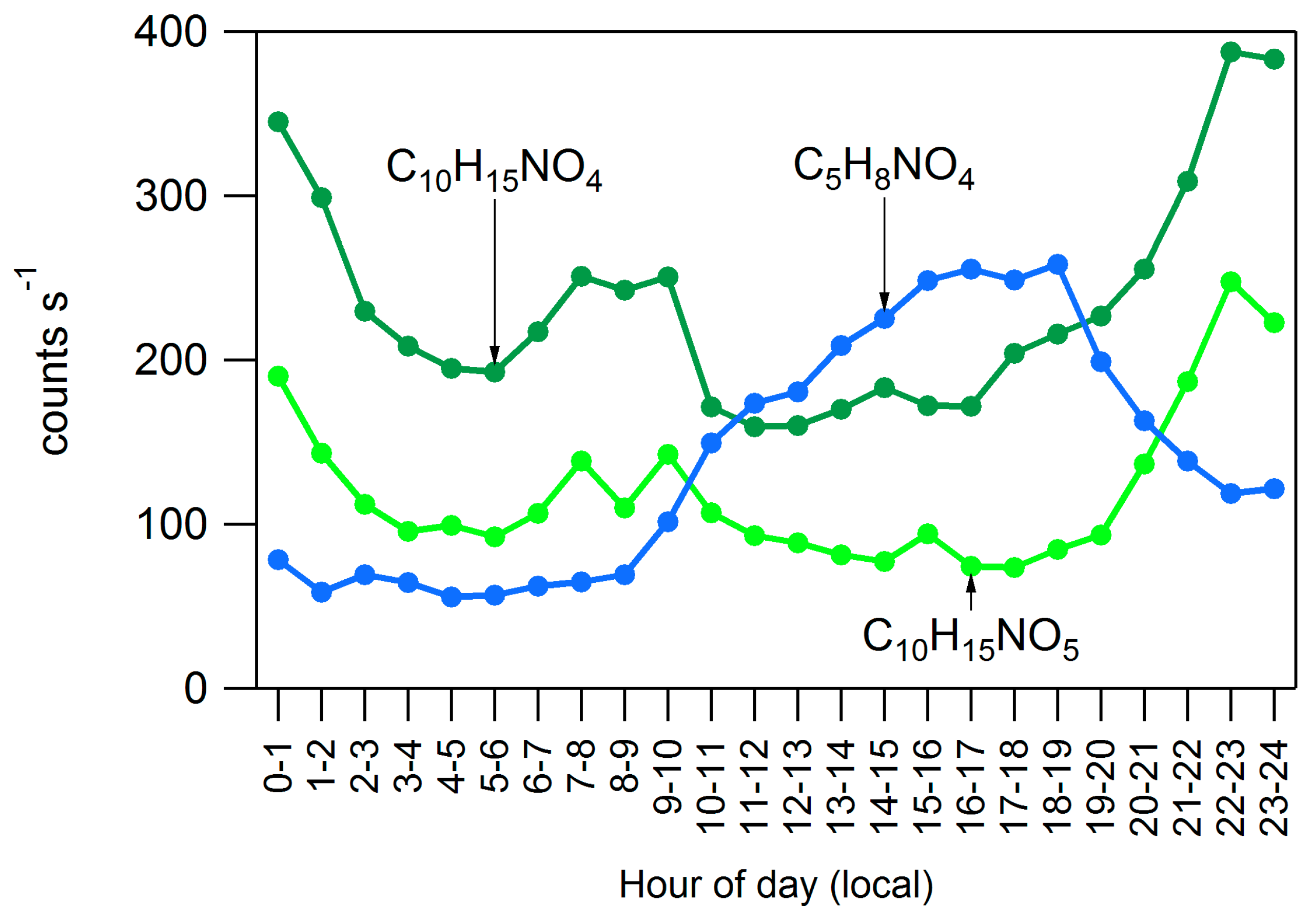 The strong diurnal cycle for organics and nitrate but lack of diurnal cycle for sulfate is consistent with a more regional source of sulfate and a more local source of organics and organic nitrates. The higher amplitude-to-mean ratio of nitrate indicates that the diurnal trend is especially prominent for nitrate and suggests that organic nitrates play a large role in the observed diurnal trends. The more pronounced diurnal changes in organic nitrates could be attributed to evaporation with increasing daytime temperatures or nighttime growth due to NO3 chemistry. NO3, formed from the reaction of NO2 and O3, is considered a night-time oxidant because it photolyzes quickly during the day.