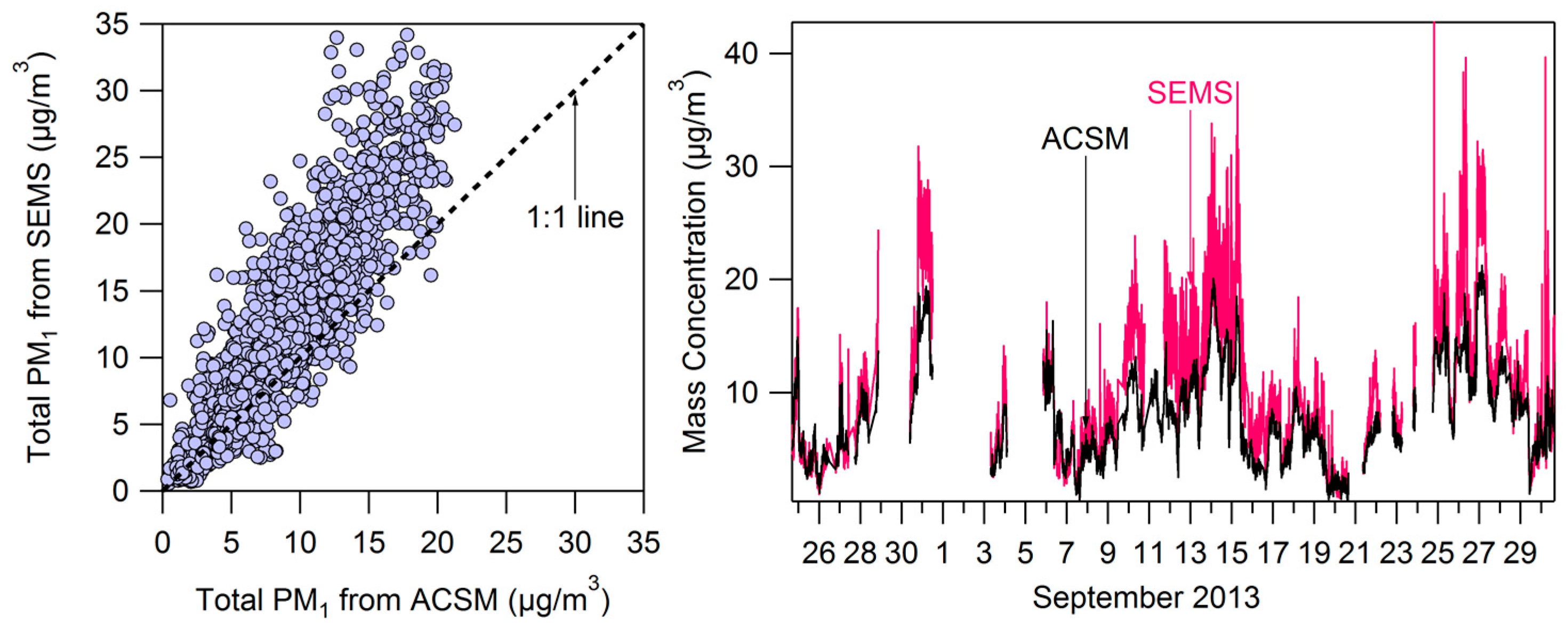 Comparison of PM1 mass measured by the SEMS and ACSM throughout the campaign.