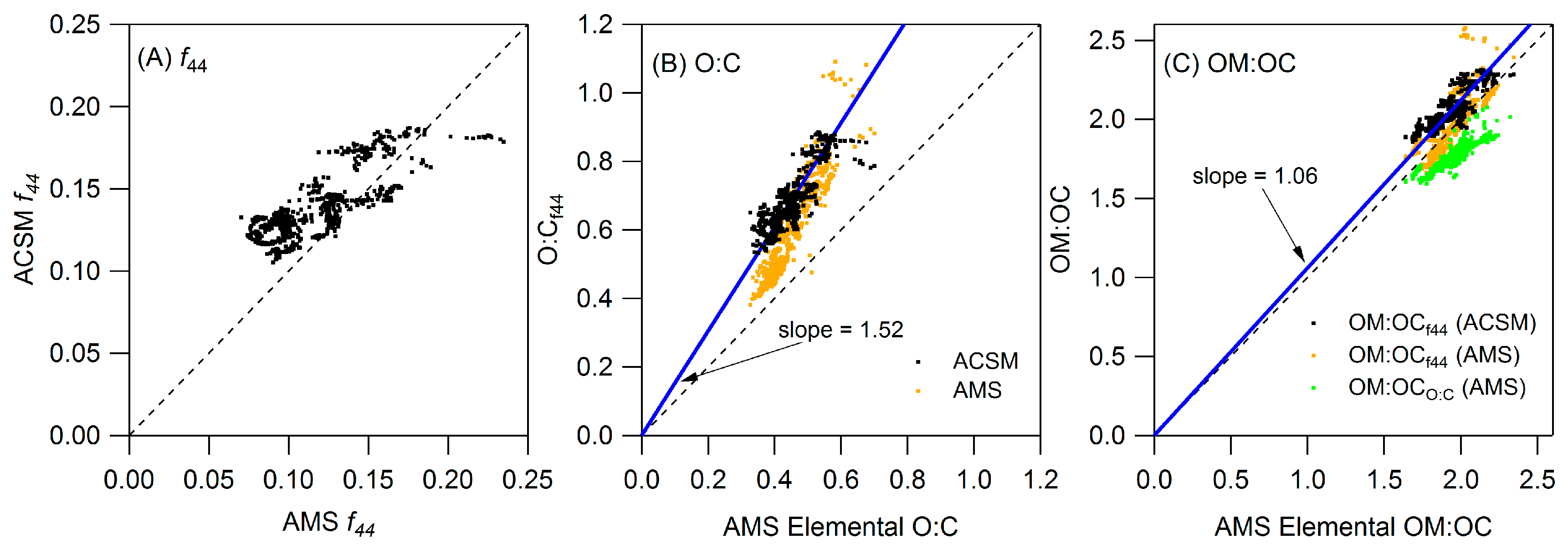 Comparison of (A) f44; (B) O:C and (C) OM:OC between the HR-ToF-AMS and ACSM.