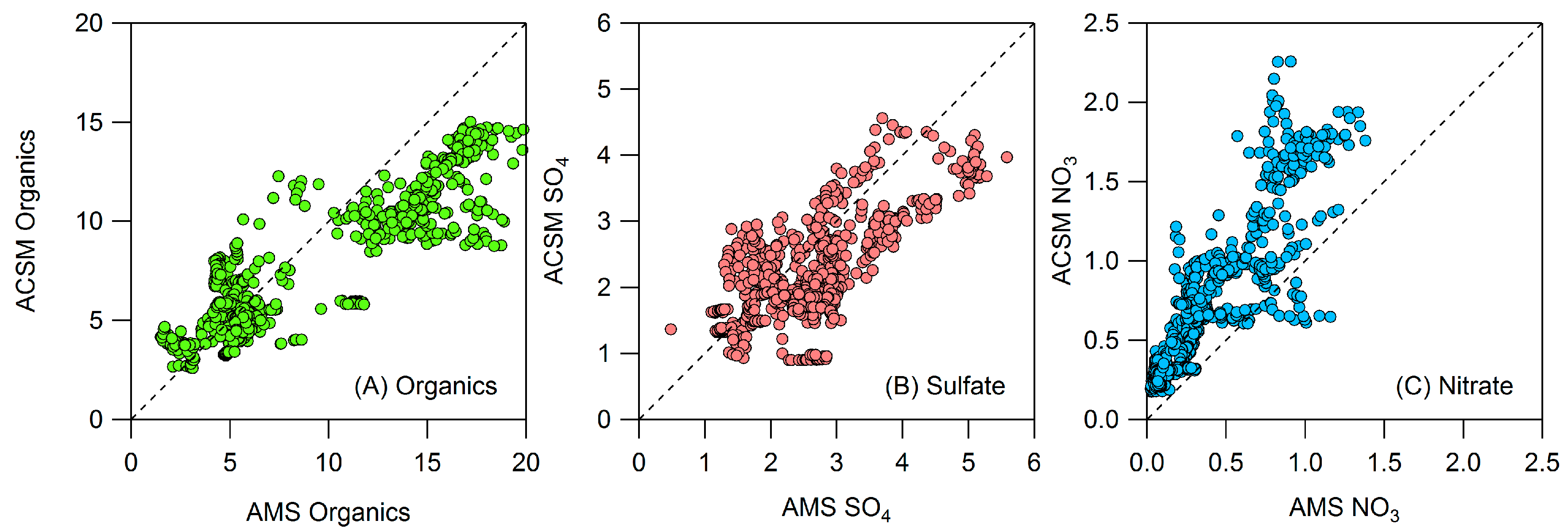 ACSM and HR-ToF-AMS comparison of (A) organics, (B) sulfate, and (C) nitrate. HR-ToF-AMS measurements are high resolution while ACSM measurements are unit mass resolution.