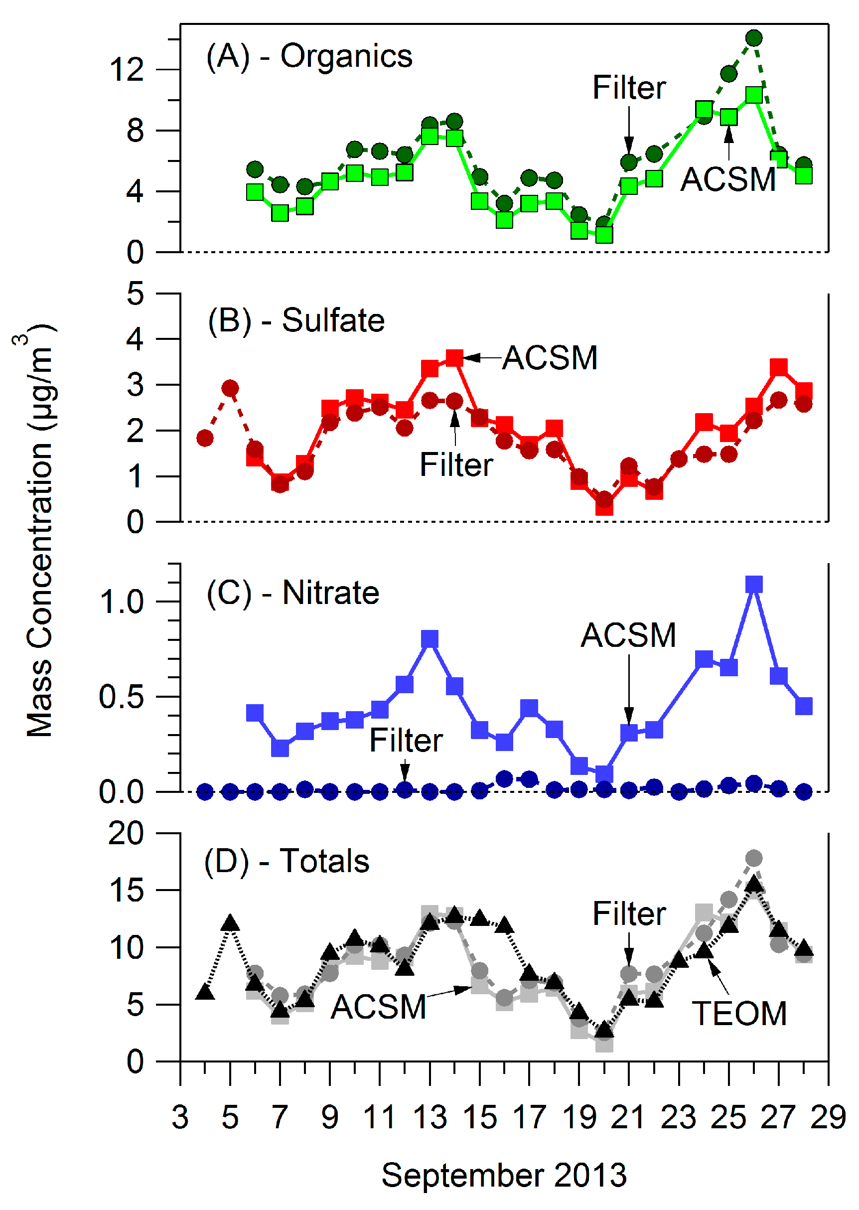 Instrument comparisons between the PM1 ACSM, PM2.5 filter, and PM2.5 TEOM measurements for. (A) Organics, (B) Sulfate, (C) Nitrate, (D) Totals.