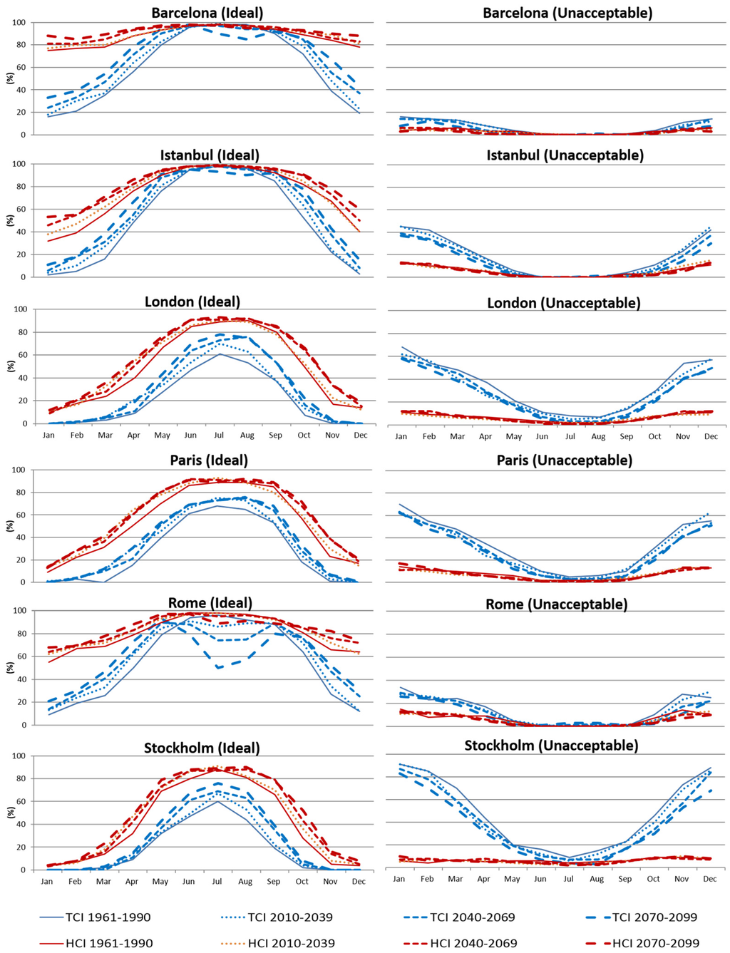 To assess the climatic suitability of Barcelona, Istanbul, London, Paris, Rome, and Stockholm for an urban holiday, mean monthly HCI:Urban and TCI scores were calculated and compared (Figure 1). The monthly probability (%) was obtained by calculating how many times daily index scores in the ideal and unacceptable categories occurred for the six city destinations. An ideal climate for urban tourism is defined as days with scores of 90–100 and unacceptable climatic conditions are defined as days with scores of <40.