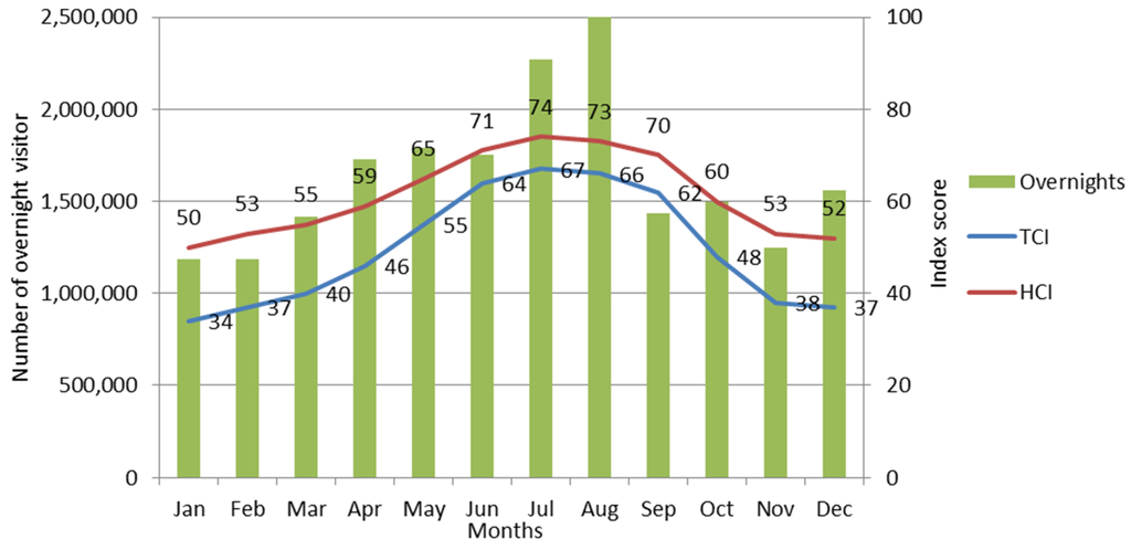 First, the HCI is theoretically sound, integrating all three facets of climate that are relevant to tourists’ holiday experience based on empirical findings of tourists’ stated climatic preferences (Table 1). The HCI is also simple to calculate, requiring only standard meteorological data that is readily available from national climate datasets. The index is also easy to use and understand, with a simple rating system (0–100) and an associated descriptor of climatic conditions (impossible–ideal) that ascribe to the recognisable system of the TCI. The HCI also recognizes the overriding effect of physical weather parameters (precipitation and wind), and, in its urban specification, the HCI assigns equal weight (40%) to thermal comfort, such that an overall rating declines rapidly when severe physical conditions (e.g., high winds, storms) persist. The HCI was also empirically tested, comparing mean monthly HCI scores with overnight hotel visits in Paris, revealing rating scores that are more reflective of tourists’ climatic preferences for a city destination versus the TCI. Additional validation against tourism performance metrics is encouraged, including visitor satisfaction.