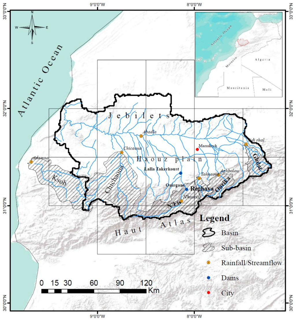To study climate and hydrological variability in the Tensift basin, we analyzed data from 7 stations: (1) Aghbalou in the Ourika sub-basin; (2) Tahanouat in the Rheraya sub-basin; (3) Iguir N’Kouris in the N’Fis sub-basin, the largest sub-basin in the Tensift; (4) Sidi Rehal in the R’dat sub-basin; (5) Chichaoua in the Chichaoua sub-basin; (6) Abadla in the Tensift River; and (7) Adamna in the Ksob basin. Located at the base of the High Atlas Mountain, except for the N’fis, the measuring station is located away from the downstream of sub-basin and Abadla located in the Tensift, the principal river (Haouz plain).