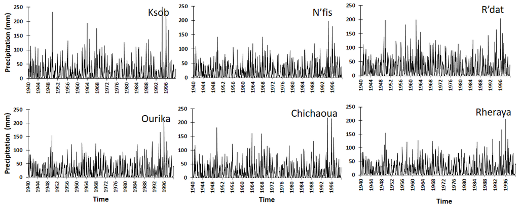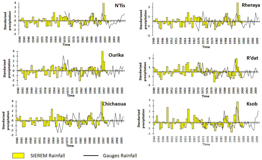 At N’fis, rainfall SIEREM and hydrological stations have the same trend over the whole period; however, in Rheraya, they progress differently. In Ourika, this variability is different during some years, namely in 1973, 1978, 1986, 1993 and 1996. Regarding the sub-basins R’dat and Chichaoua, the comparable variables exhibit different variability during the periods ranging, respectively, from 1986–1990 and 1976–1980; however, this pattern is similar in Chichaoua during the rest of the time series displaying some short duration difference. In the Ksob basin, rainfall SIEREM and the studied stations have the same variability, except in 1977 and 1984–1986 where the trend is different.