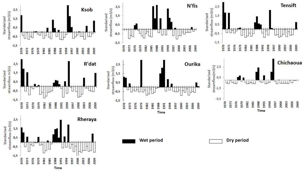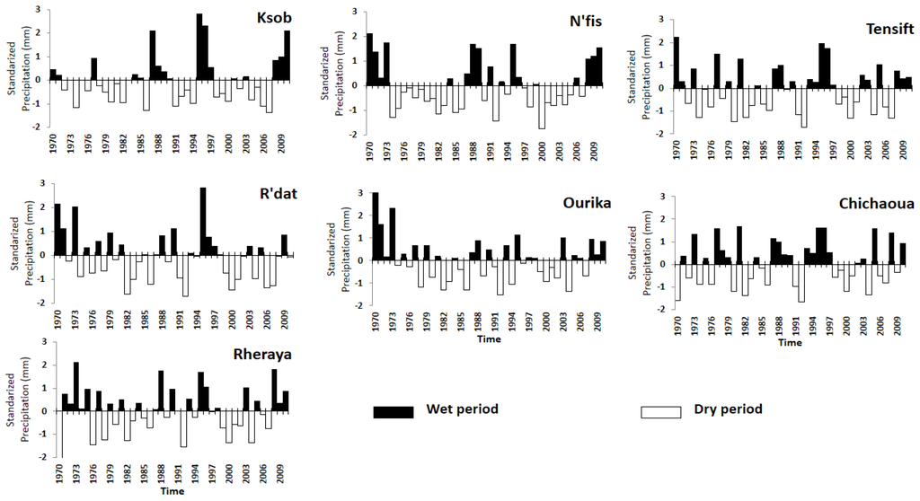 Standardized annual rainfall during the period between 1970 and 2010 displayed five distinct periods in Tensift River and its two sub-basins (N’Fis and R’dat) and also Ksob basin, four periods in the Chichaoua and Rheraya sub-basins, and three periods in the Ourika sub-basin (Figure 3).