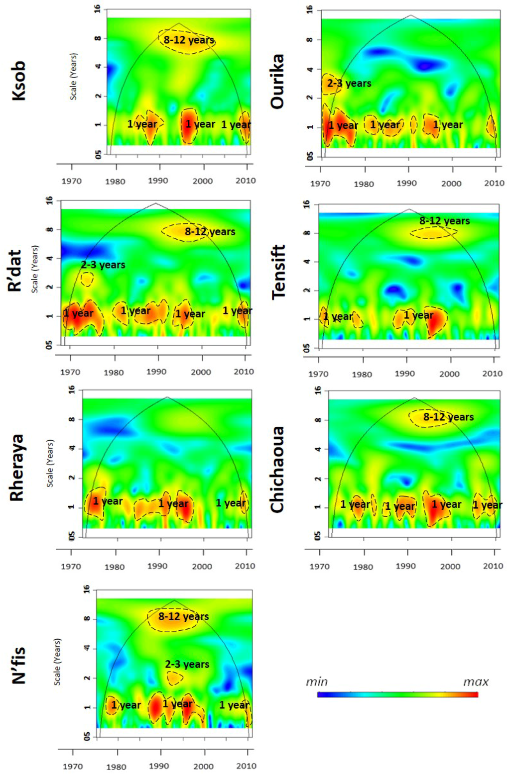For the N’Fis and Ourika sub-basins, the annual cycle is generally characterized by strong attenuation during the 1970s (except for the Ksob) and during the 1990s. The 2–4-year band corresponds to a high-power fluctuation for all sub-basins expect the Tensift River from the early to the mid-1990s. It occurs also in the early to mid-1970s (Tensift river, R’dat), the mid-1970s (Rheraya) and around 1980 (Ourika). Strong 8–12-year bands are identified in all regions except Rheraya.