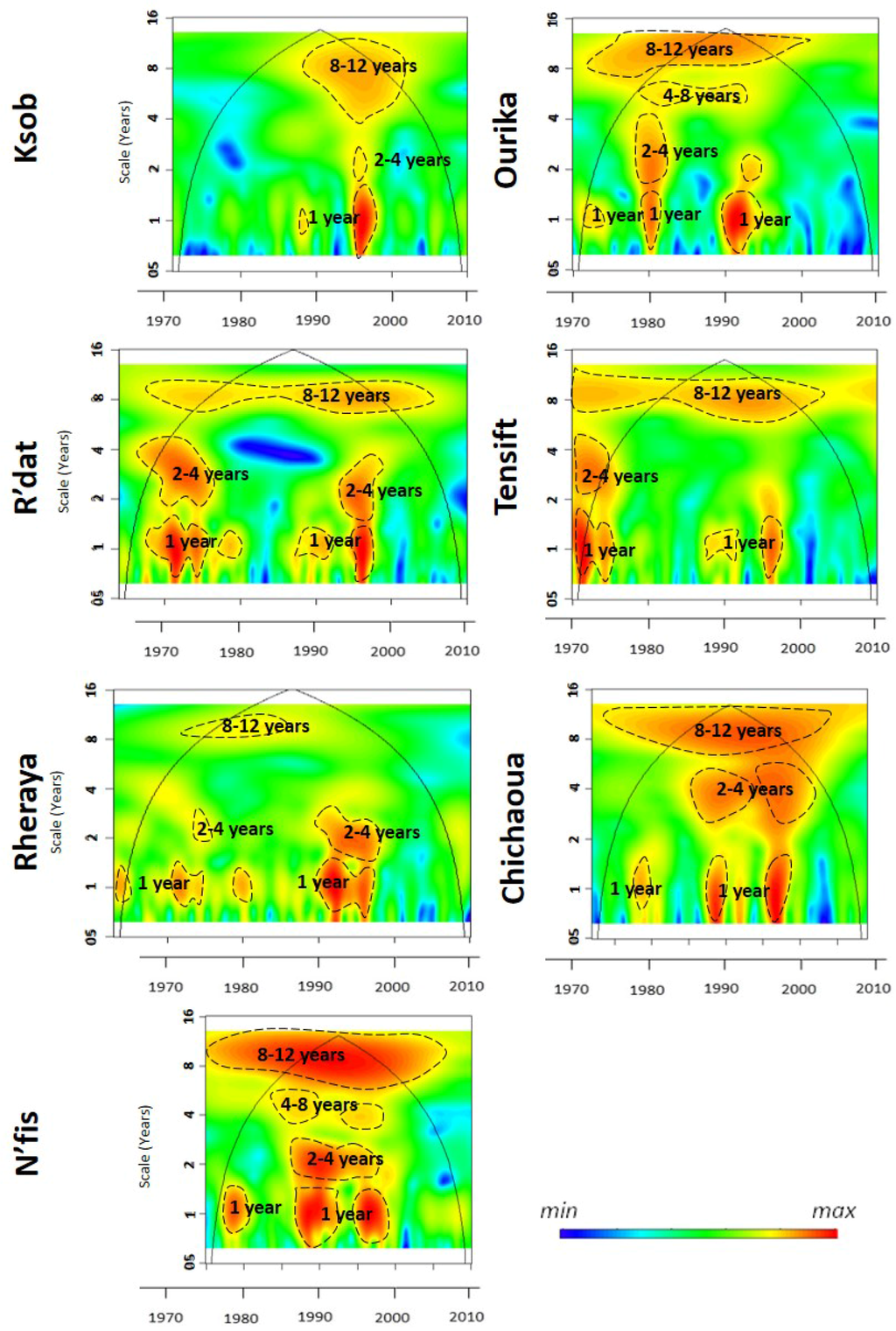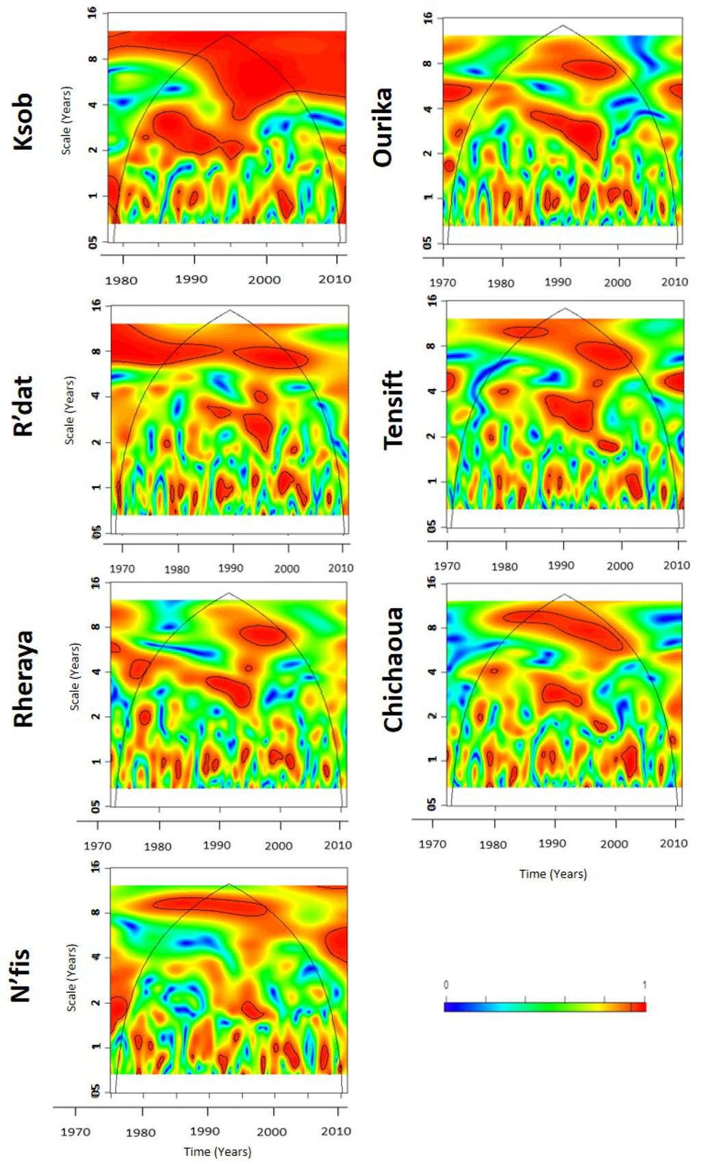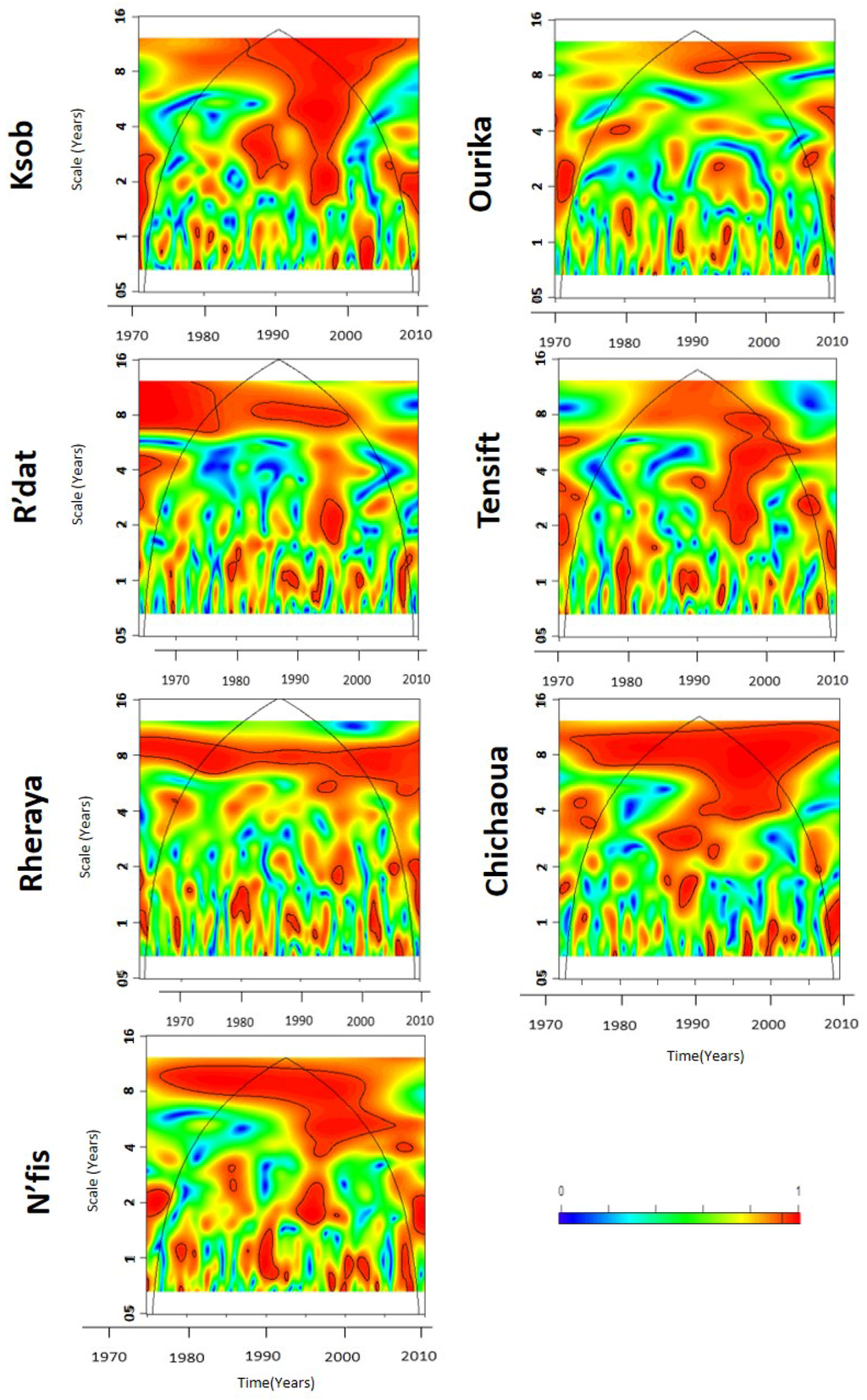 The Wavelet analysis of data precipitation shows several energy bands from the annual to interannual scales (2–3 year and 8–12 year) (Figure 6) (Table 2). In the Tensift River and the sub-basins, a frequency of one year is more identified. The 2–3 year band was only detected in the Ourika and the R’dat sub-basins for the first half of the 1970s and in the N’fis sub-basin for the first half of the 1990s. The eight-year band is observed in the Tensift River, Ksob, Chichaoua and N’fis sub-basins during the 1990s. The Ksob and N'fis basins are characterized by discontinuities during the mid-1980s and 2000s. For the Tensift River and Chichaoua, these discontinuities are observed in 1990 and 2000, which delimit three periods. Regarding the R’dat and Ourika basins, we find four periods according to the discontinuities in 1970, 1990 and 2000, while, in the Rheraya, we identify only two periods around a discontinuity in 2000.