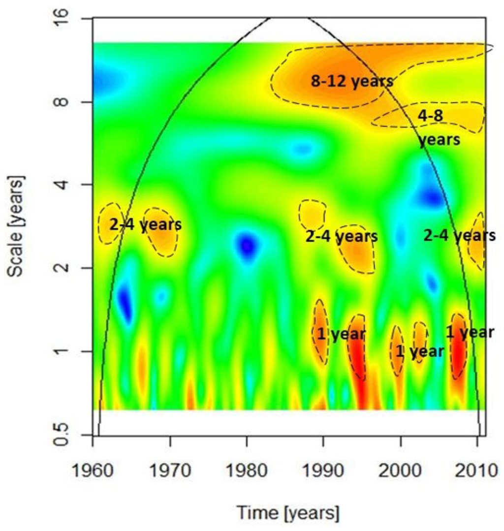 From the NAO wavelet analysis during the period ranging between 1960 and 2011 (Figure 11) we identify a long lasting energy loss from approximately 1970 until the late 1980s. We find also intermittent annual bands from 1990 to 2007; 2–4-year bands in the 1960s, in the early to mid-1990s and around 2010; a 4–8-year band from nearly 1998 to 2010; and a relatively strong 8–12-year band from the mid-1980s to 2010. On the streamflow and rainfall spectrum, we find discontinuities in 1980 period. The study carried out by Rossi et al. [12] on the Mississippi area showed the presence of discontinuities around the 1970s and 1980s. Other discontinuities were also identified during 1970 and 1990 in the Colorado [14].