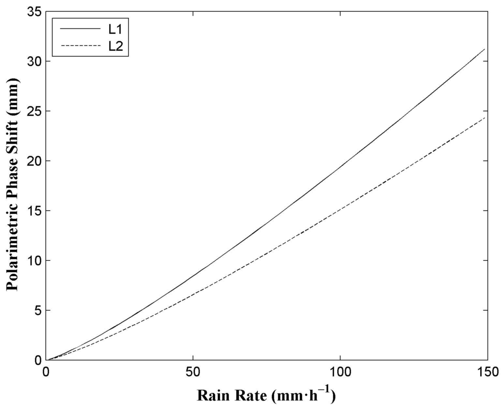 Figure 1 indicates that the rain polarimetric phase shift of GNSS signals is sensitive to the rain rate. Therefore, rain rate estimation based on relation is theoretically feasible.