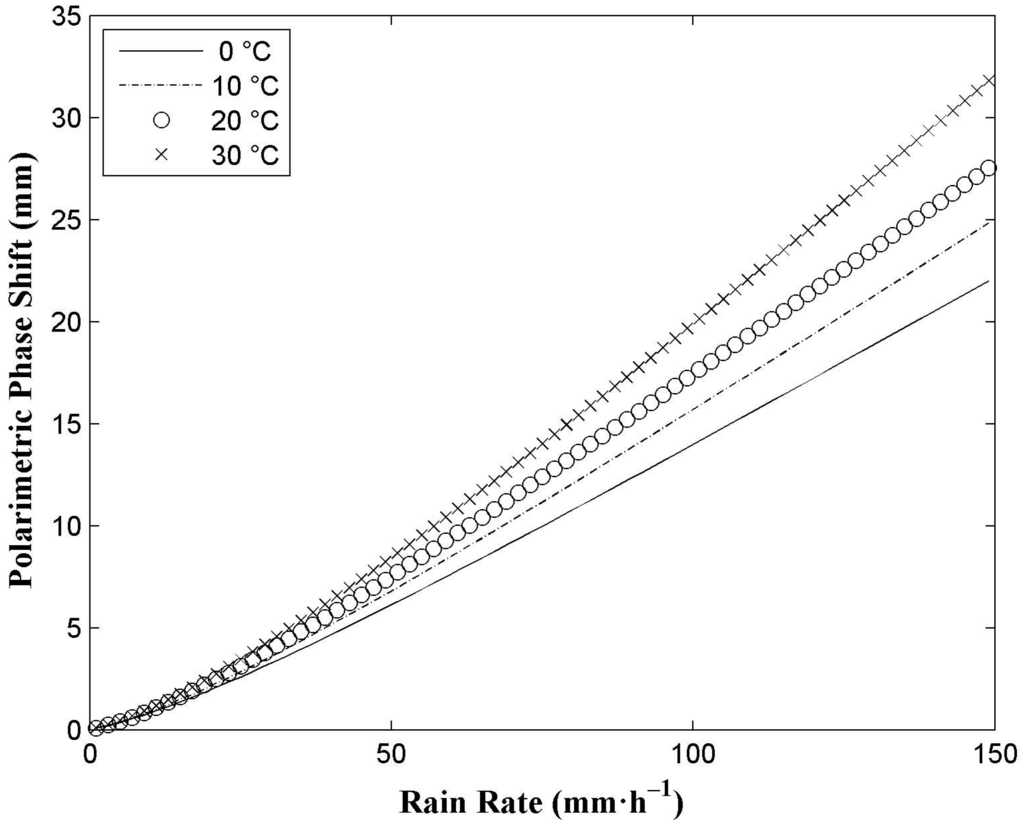 Effect of temperature on the relation between polarimetric phase shift and rain rate over a range of temperatures by a 20-km-long, uniformly filled rain path at the L1 (1575.42 MHz) frequency of GPS signals.