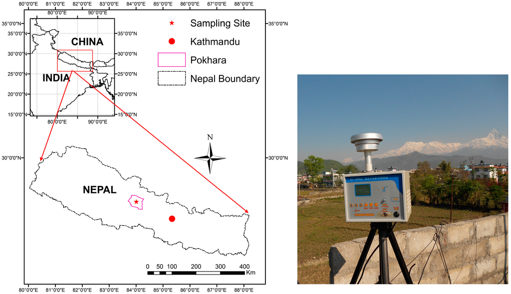 Pokhara is a sub-metropolitan urban city in the foothills of the Himalayas, Nepal that is one of the famous tourist destinations. About 250,000 tourists visited Pokhara during the year 2013. Pokhara is also the second biggest valley in Nepal after the Kathmandu valley (Capital of Nepal) and is about 200 km west of Kathmandu valley. The total area of Pokhara sub-metropolitan is 55.66 km2 with a population of about 350,000. TSP sampling was carried out at 28.18°N and 83.98°E with an altitude of 813 m a.s.l. on the rooftop of a residential building about 6 m high (Figure 1). Pokhara valley is located in the humid climatic zone and has one of the highest precipitation rates (about 3000 mm per year) in Nepal [15]. Summer is humid, with most rainfall occurring during the monsoon season (July–September). During winter and spring, the sky is generally clear and sunny [16]. However, the site is increasingly affected by haze transported from the Indo-Gangetic Plain (IGP), mostly during the dry periods as explained by prior studies [17,18] from the IGP site.