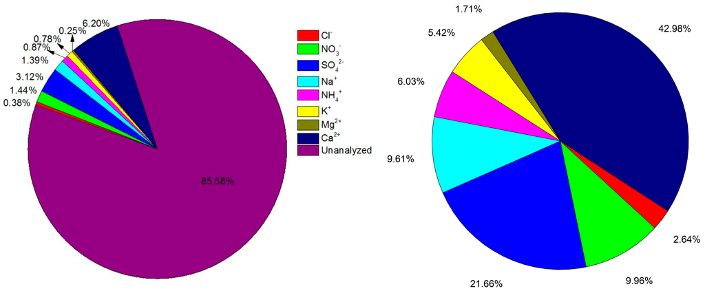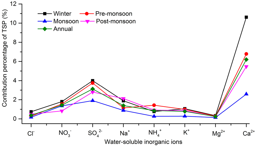 Furthermore, the percentage contribution of mass concentration in TSP with the WSIIs at different seasons (pre-monsoon, monsoon, post-monsoon, and winter) has been presented in Figure 4. The proportion of concentration contribution of two main anions was of same order (SO42− (4%) > NO3− (1.8%)) during winter and pre-monsoon but was 2 times less (SO42− (1.8%) > NO3− (0.8%)) during monsoon, implying concentration values decreased during monsoon. The percentage contribution of Ca2+ was the highest of all the measured ions in TSP during all seasons, with a peak of 11% during winter and 7% during pre-monsoon, suggesting higher dust loadings during the dry period. It can be noted that higher mass percentage of TSP and WSIIs was during the non-monsoon period and lower during monsoon period, and more risk of atmospheric pollution during those dry periods at our sampling sites.