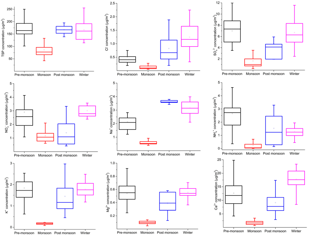 Seasonal variations of TSP and water-soluble inorganic ions (WSIIs) concentrations.