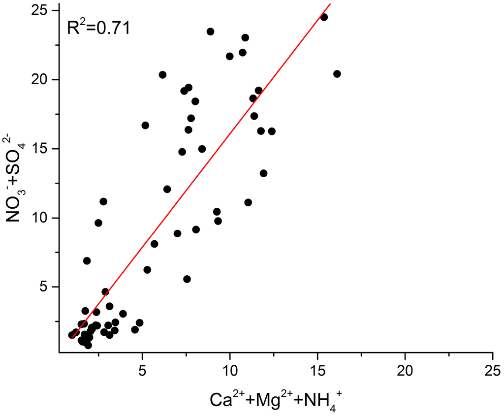 Scatter plot between [NO3− + SO42−] and [Ca2++ NH4+ + Mg2+] at Pokhara valley.