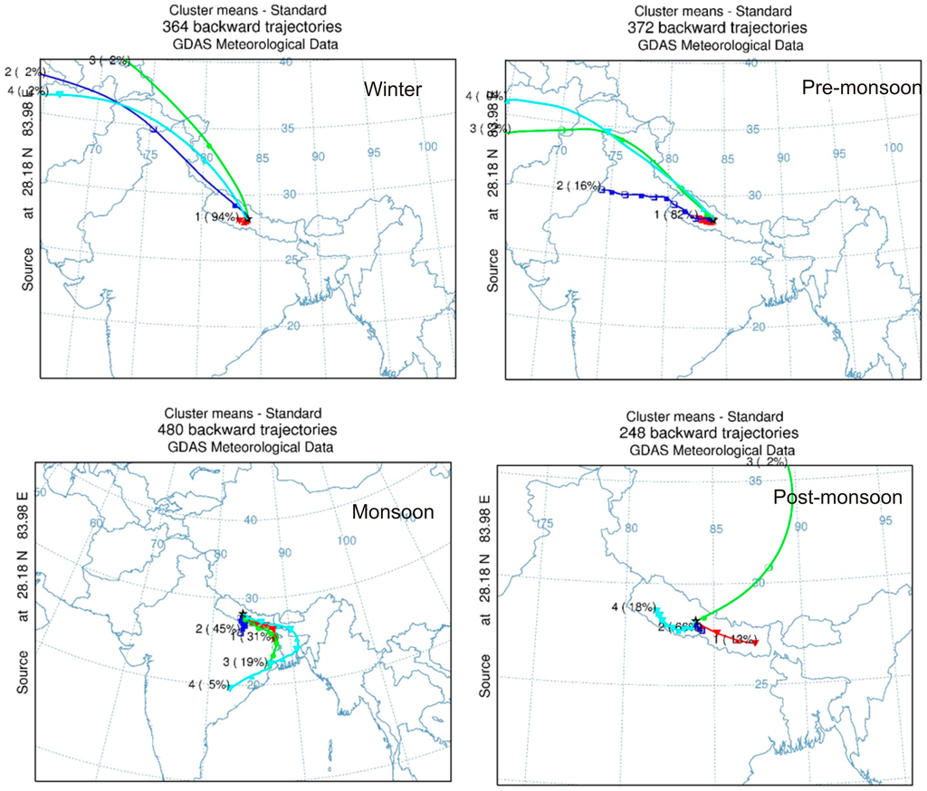 Five-day air mass back trajectories (500 m height) at different seasons (Winter: December–February, Pre-monsoon: March–May, Monsoon: June–September, Post-monsoon: October–November) arriving the sampling site.
