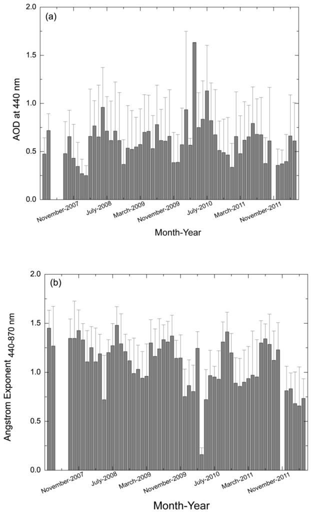 Figure 2a,b show the values of the annual mean AOD440 nm and Ångström exponent (440–870 nm) from April 2007 to April 2012 at Dalian monitoring station. The annual mean ± SD (standard deviation) values of the AOD440 nm were 0.58 ± 0.43, 0.60 ± 0.38, 0.69 ± 0.44 and 0.56 ± 0.39 in 2008, 2009, 2010 and 2011, respectively. The annual mean ± SD Ångström exponents were 1.17 ± 0.30, 1.14 ± 0.30, 1.05 ± 0.33 and 1.04 ± 0.36 in 2008, 2009, 2010 and 2011, respectively, which suggests that the area around the Dalian monitoring station was mainly dominated by small particles. The multi-year average AOD440 nm at Dalian was about 0.59 ± 0.40, which was lower than at other coastal sites in China, such as Tianjin (0.74), Nanjing (0.89), Hangzhou (1.01), Pudong (0.80), Panyu (0.78) and Nanning (0.82), reported by Che [25]. The lower aerosol loading at Dalian suggests that rapid economic development and other anthropogenic activities have less effect on this coastal region of Northeast China than in other Chinese coastal cities, which often have serious atmospheric pollution from particulate matter.