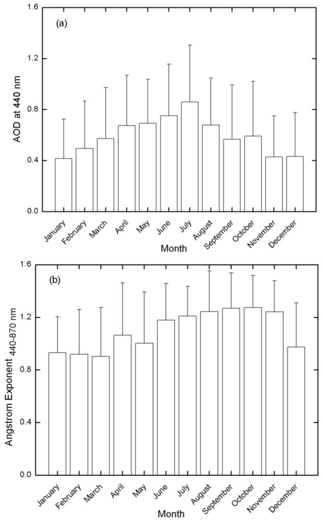 3.1. Annual and Monthly Variations in the AOD and Ångström Exponent