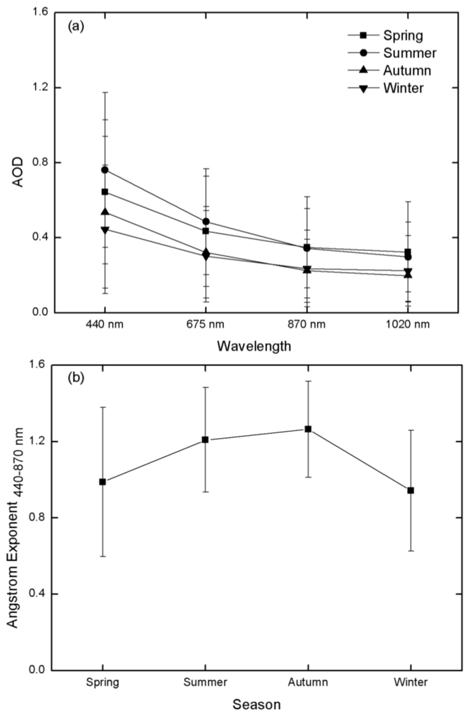 Figure 4a shows the seasonal average AOD values at 440, 675, 870, and 1020 nm and Figure 4b shows the values of the Ångström exponent (440–870 nm) measured at Dalian monitoring station. The mean ± SD values of AOD440 nm were 0.64 ± 0.38, 0.76 ± 0.41, 0.54 ± 0.40, and 0.45 ± 0.34 in spring, summer, autumn, and winter, respectively. The higher AOD recorded in summer was the same as the result obtained for Shenyang (Figure 1), an inland urban site in Northeast China. However, the lower AOD recorded in winter at Dalian monitoring station was different from that recorded at Shenyang, which may due to lower levels of domestic heating in this season because of the warmer climate [41]. The comparably higher AOD values in summer are most likely to be a result of the larger amounts of water vapor in the atmosphere during this season. Aerosols can easily absorb moisture and grow hygroscopically, which favors the formation of aerosols [58,59,60]. High temperatures can also increase the amount of secondary organic aerosol particles by the photochemical reaction, which may be related to the higher AOD values recorded in summer [61].
