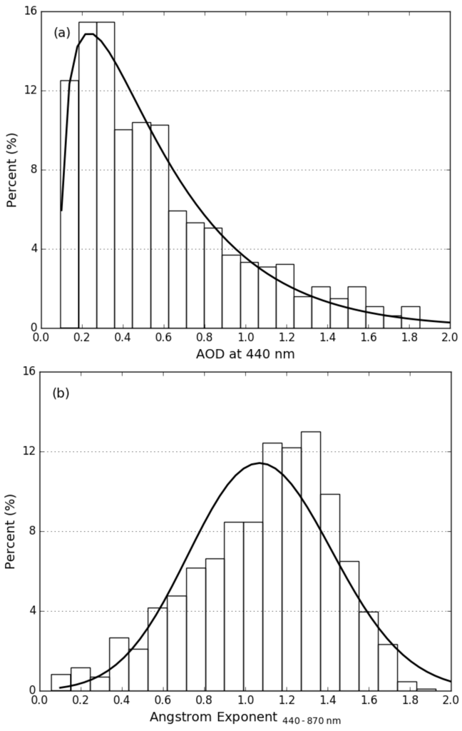 Figure 5a,b show the frequency distributions of the AOD440 nm and Ångström exponent (440–870 nm), respectively, for the instantaneous data recorded at Dalian monitoring station. We used bin intervals of 0.10 for these two parameters.