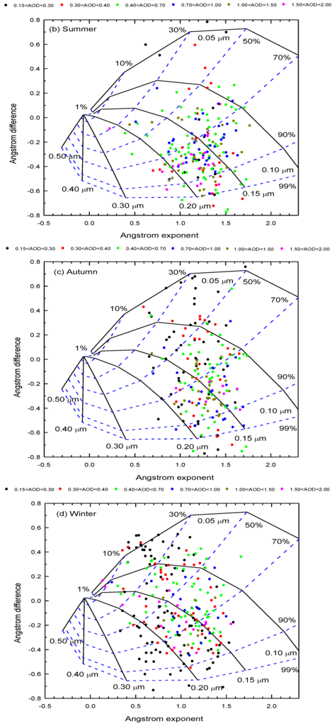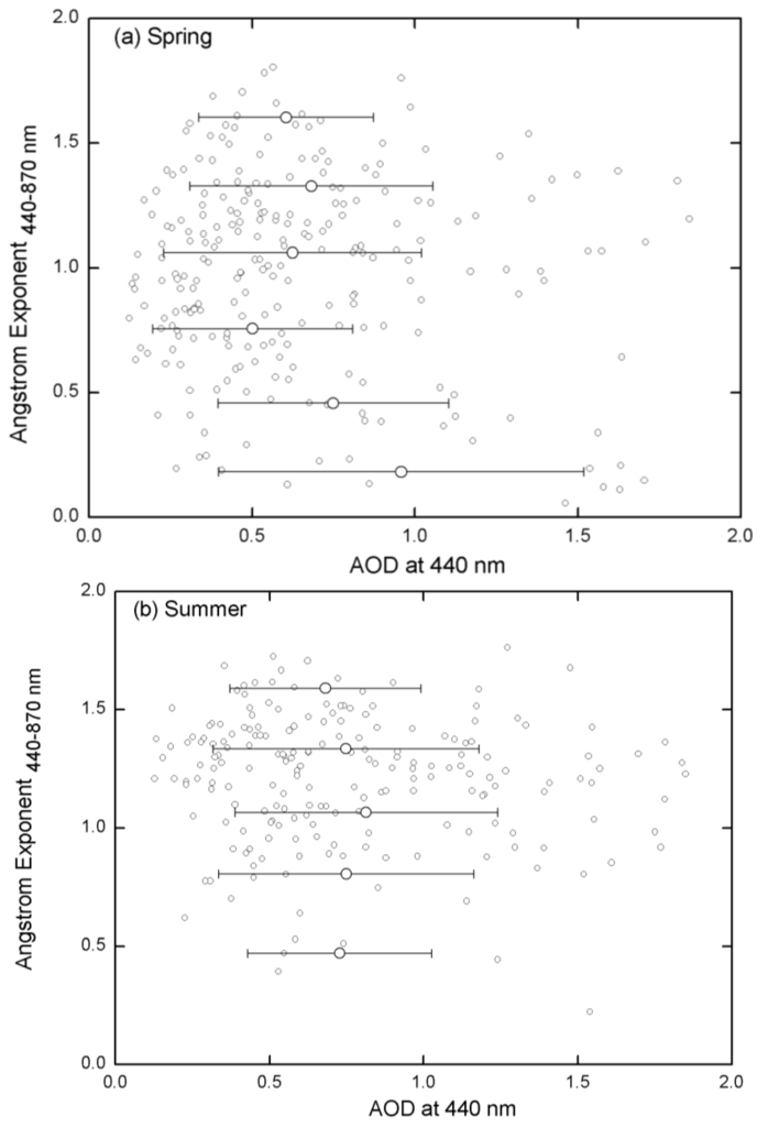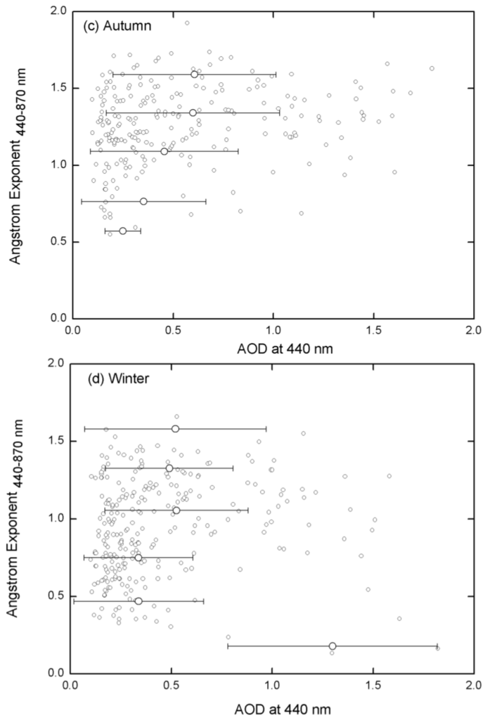 Figure 6a–d are scatter grams of the AOD440 nm and Ångström exponent (440–870 nm) values based on instantaneous data from different seasons. The open circles with error bars represent the average AOD for the following ranges of the Ångström exponent (440–870 nm): 0.00–0.30, 0.30–0.60, 0.60–0.90, 0.90–1.20, 1.20–1.50, and 1.50–2.00.
