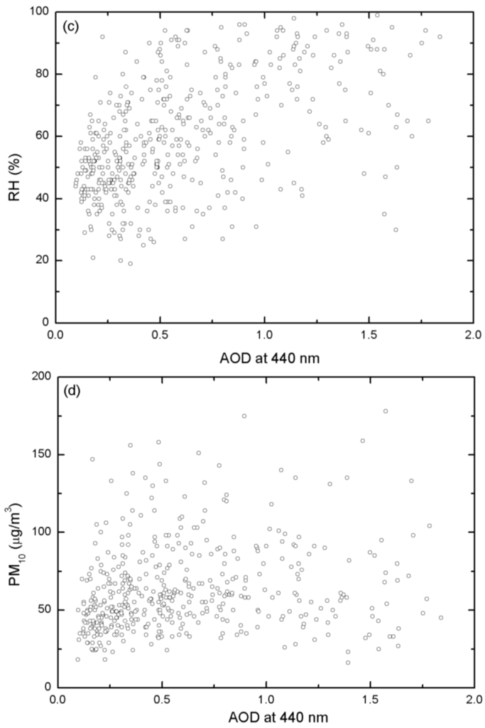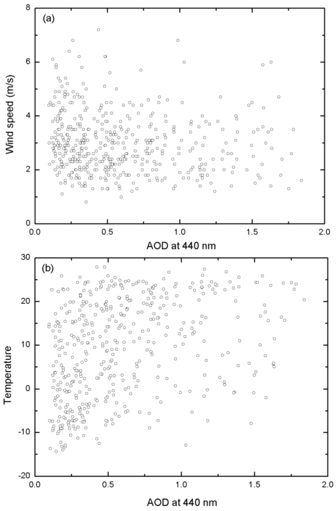 Moreover, the averages of wind speed, temperature, RH and PM10 mass concentration within the different ranges of AOD440 nm about 0.00–0.15, 0.15–0.30, 0.30–0.40, 0.40–0.70, 0.70–1.00, 1.00–1.50 and 1.50–2.00 are presented in Table 2. When the AOD440 nm is lower than 0.30, the wind speed was almost >3.0 m/s and the average RH was less than 50% with the lower temperature about 3.0 °C. The corresponding PM10 mass concentration is about 50 µg/m3 during this range. When the value of AOD440 nm is increased, the wind speed was decreased below 3.0 m/s, while the temperature and RH was obviously increased. The PM10 mass concentration was also increased along with the AOD440 nm, and the higher PM10 mass concentration (73.6 ± 35.6 µg/m3) was observed in the range of 0.70–1.00 of AOD440 nm.