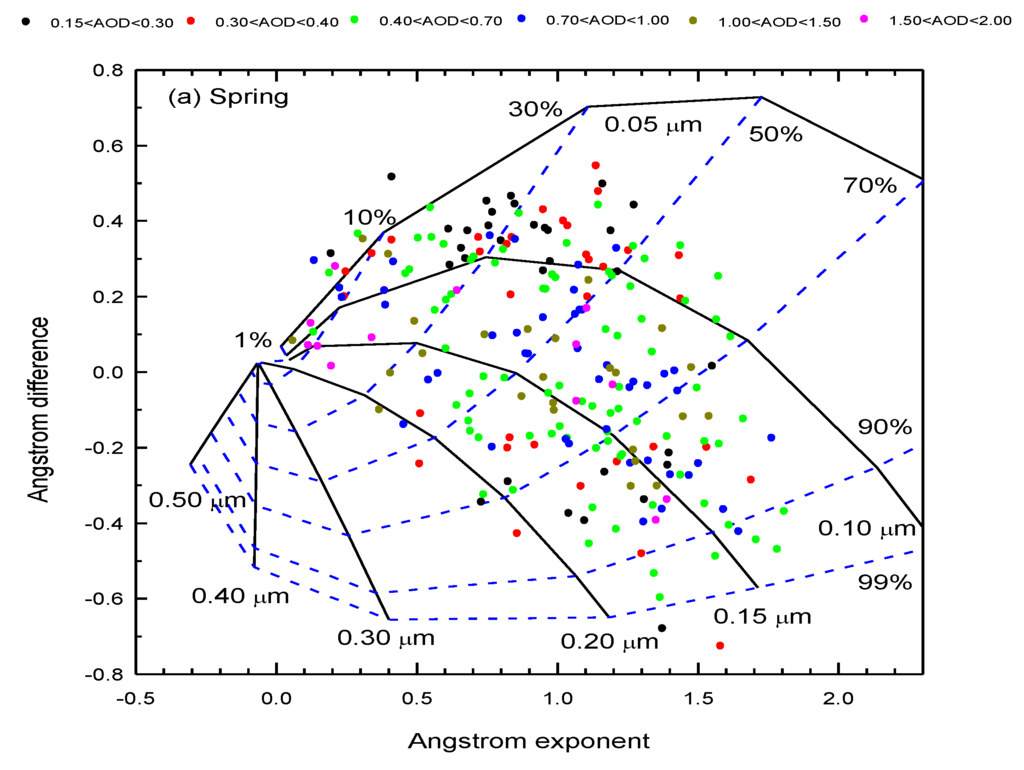 This graphic method can be used to separate the coarse mode aerosol growth from cloud contamination and the dominance of fine mode aerosols to the total AOD440 nm according to the spectral variation of Ångström exponent as Gobbi [54] and Schuster [68] depicted. The spectral difference in the Ångström exponent (α), defined as δα = α440–675 nm − α675–870 nm, was used to distinguish aerosol growth from cloud contamination and to examine aerosol humidification using instantaneous observational data. In this framework, Rf is the modal radius of the smaller mode of the size distribution, η is defined as the fractional contribution of fine mode aerosol to total AOD440 nm. The AOD440 nm data are represented by different colors in Figure 8. The black solid lines represent a fixed size of the fine mode Rf, and the dashed blue lines represent a fixed fraction contribution η of the fine mode to the total AOD440 nm. The Ångström difference is presented as a function of the Ångström exponent (440–870 nm) and the AOD440 nm values for bimodal log-normal size distributions with refractive indices of m = 1.40–0.001i based on Gobbi [54].The climatology of Dubovik [15] also indicates that this refractive index (m = 1.40–0.001i) is typical of urban and industrial aerosols compared with the mineral dust aerosols (m = 1.53–0.003i) and plus water droplets (m = 1.33–0.000i). Gobbi [54] illustrates that there is a weaker sensitivity of the η curves than the Rf with the refractive index in the different classification scheme, and the scheme is robust enough to provide an operational classification of the aerosol properties or size distribution parameters within this level of indetermination. A cloud contamination or a contribution of coarse aerosols to the AOD of more than 90% will be located at δα ~ 0. In the opposite direction, hydration leads to an increase in fine mode aerosols (Rf) and an increase in the fractional contribution (η) of the fine mode aerosols to the total AOD440 nm.
