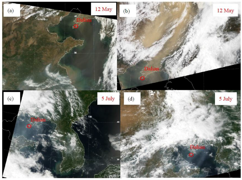 The MODIS satellite images in Figure 9a,b clearly show dust at Dalian monitoring station. The images in Figure 9c,d show fog either over or near to Dalian monitoring station. Figure 10a,b illustrate the transport of aerosol particles based on the NOAA HYSPLIT back-trajectory model analysis [70] of the dust and fog events, respectively.
