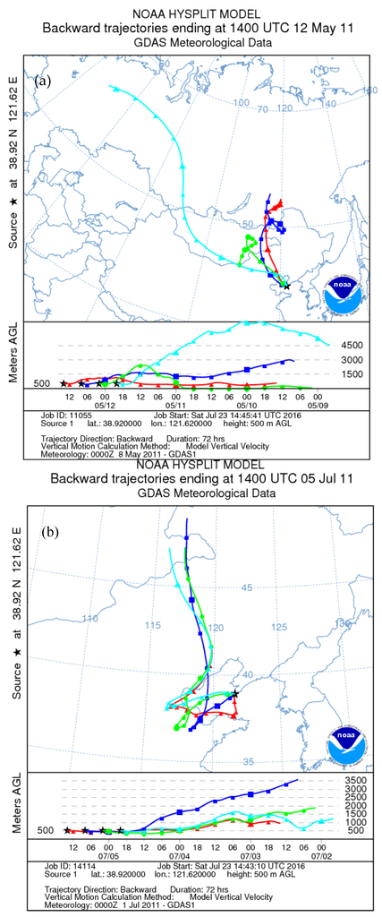 HYSPLIT back-trajectories on Dalian monitoring station for (a) dust and (b) fog events.