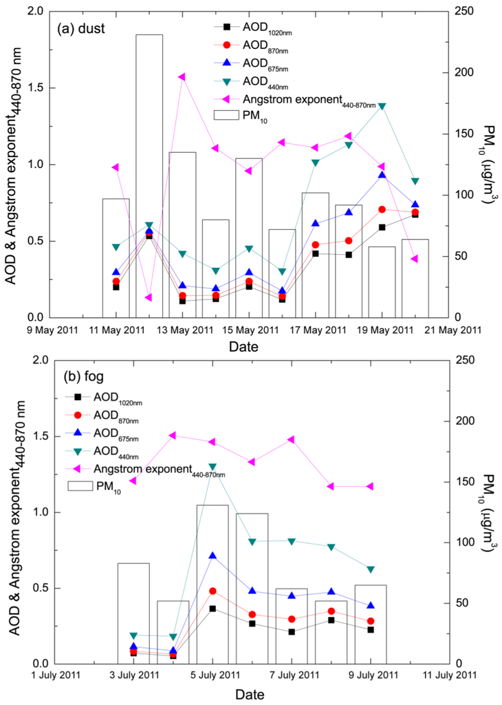 Daily average values of AOD, Ångström exponent and PM10 at Dalian, China for (a) dust and (b) fog events.